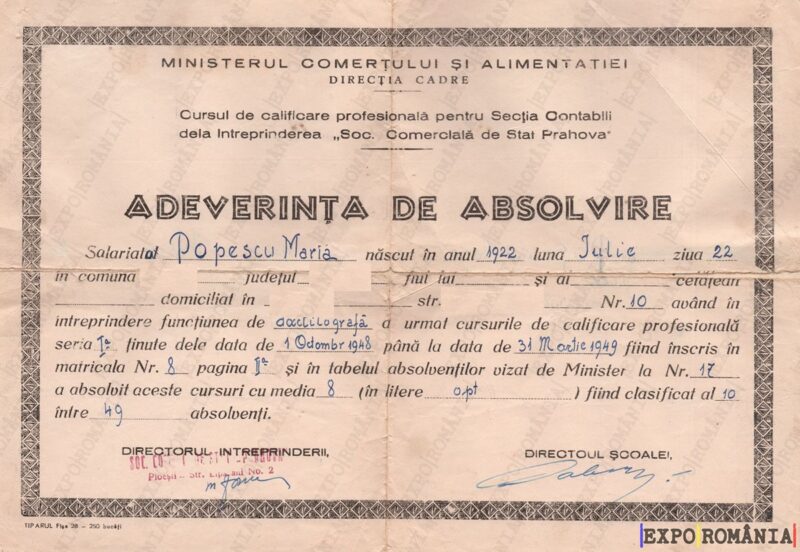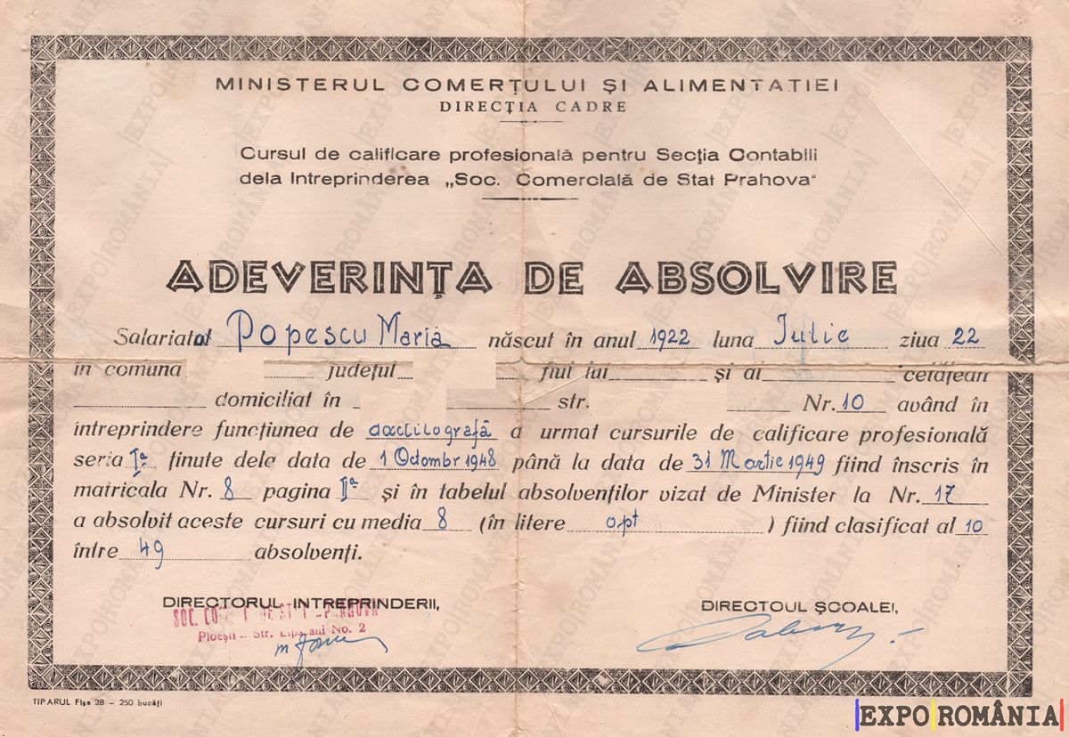 Ești aici: Prima pagină - Exponate - Acte - Adeverinta de Absolvire – Anii ’40 – 01