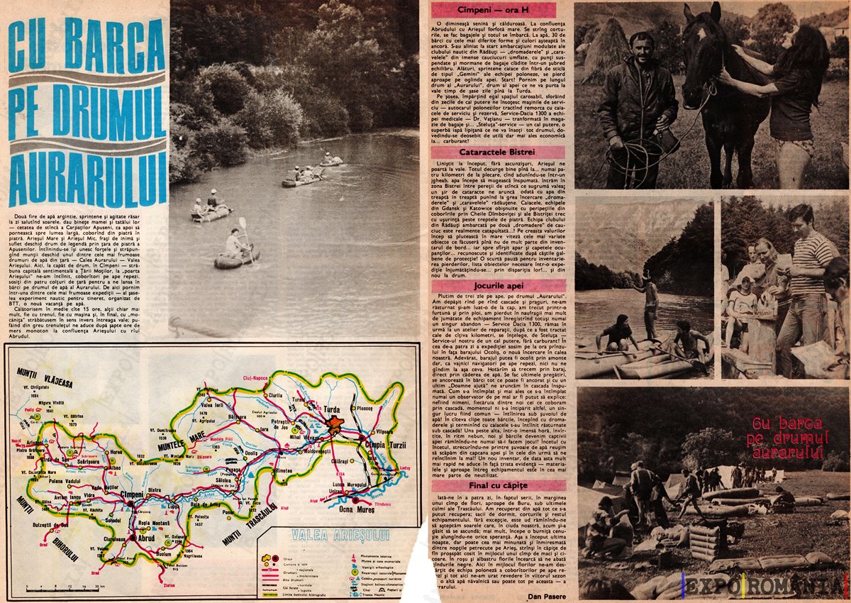 Două fire de apă argintie, sprintene și agitate răsar la zi salutînd soarele, dau binețe mamei și tatălui lor — cetatea de stîncă a Carpaților Apuseni, ca apoi să pornească spre lumea largă, coborînd din piatră în piatră. Arieșul Mare și Arieșul Mic, frați de inimă și suflet deschid drum de legendă prin țara de piatră a Apusenilor. Întîlnindu-se își unesc forțele și străpungînd munții deschid unul dintre cele mai frumoase drumuri de apă din țară — Calea Aurarului — Valea Arieșului. Aici, la capăt de drum, în Cîmpeni — străbuna capitală sentimentală a Țării Moților, la „poarta Arieșului” ne-am întîlnit, coborîtori pe ape repezi, sosiți din patru colțuri de țară pentru a ne lansa în bărci pe drumul de apă al Aurarului. De aici pornim într-una dintre cele mai frumoase expediții — al șaselea experiment nautic pentru tineret, organizat de BTT, o nouă vacanță pe apă.