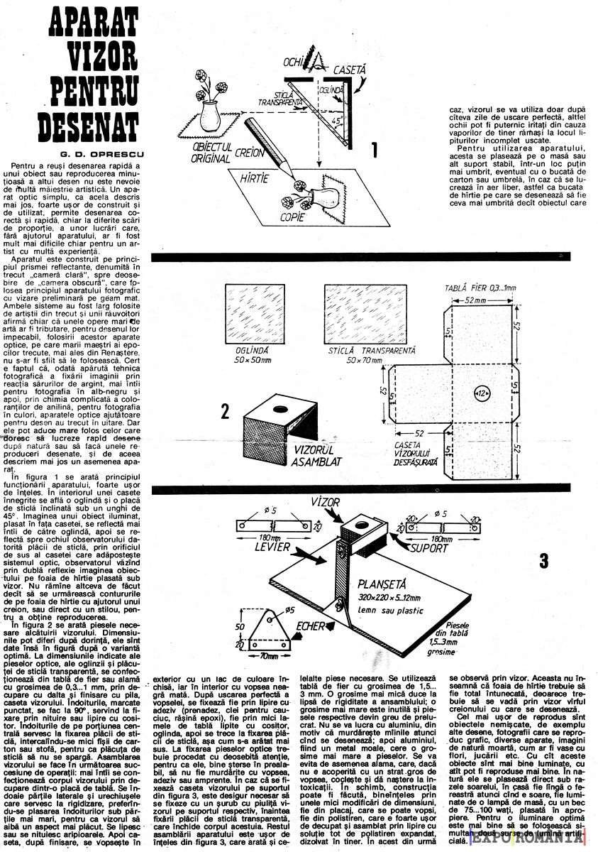 Pentru a reuși desenarea rapidă a unui obiect sau reproducerea minuțioasă a altui desen nu este nevoie de multă măiestrie artistică. Un aparat optic simplu, ca acela descris mai jos, foarte ușor de construit și de utilizat, permite desenarea corectă și rapidă, chiar la diferite scări de proporție, a unor lucrări care, fără ajutorul aparatului, ar fi fost mult mai dificile chiar pentru un artist cu multă experiență.