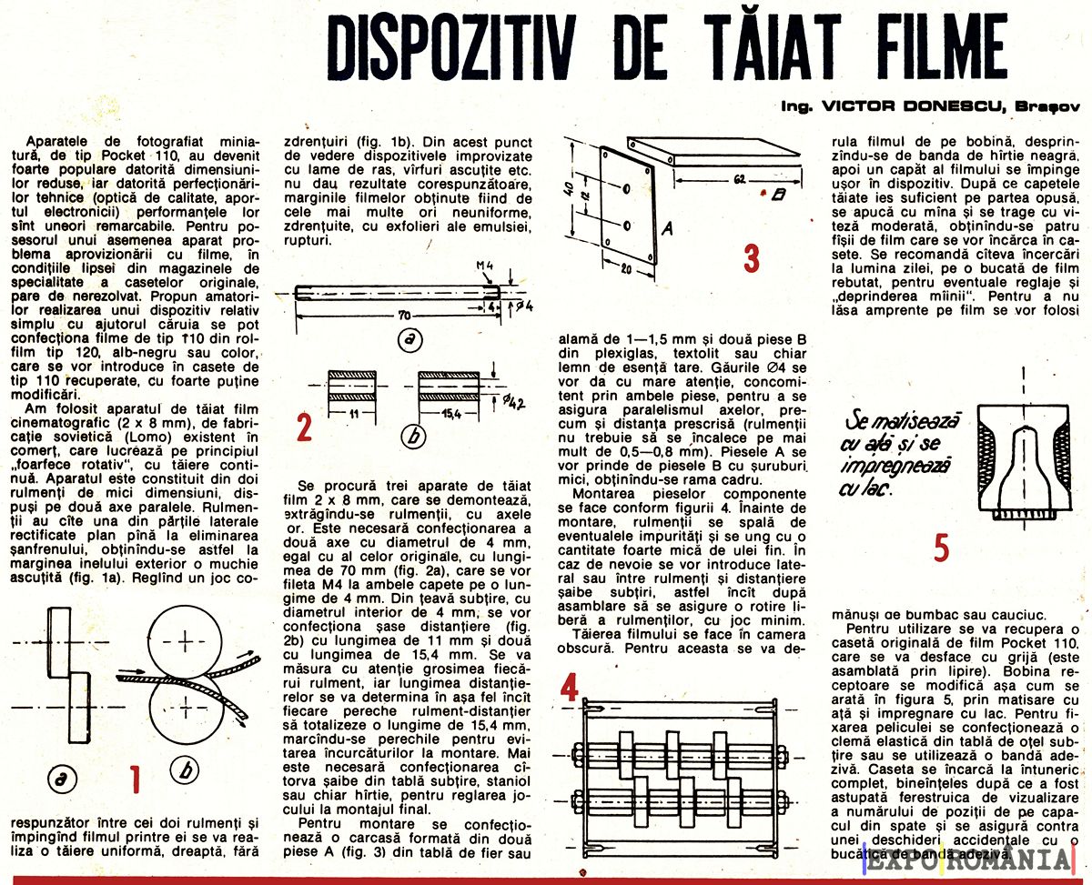 Aparatele de fotografiat miniatură, de tip Pocket 110, au devenit foarte populare datorită dimensiunilor reduse, iar datorită perfecționărilor tehnice (optică de calitate, aportul electronicii) performanțele lor sînt uneori remarcabile. Pentru posesorul unui asemenea aparat problema aprovizionării cu filme, în condițiile lipsei din magazinele de specialitate a casetelor originale, pare de nerezolvat. Propun amatorilor realizarea unui dispozitiv relativ simplu cu ajutorul căruia se pot confecționa filme de tip 110 din rol-film tip 120, alb-negru sau color, care se vor introduce în casete de tip 110 recuperate, cu foarte puține modificări.