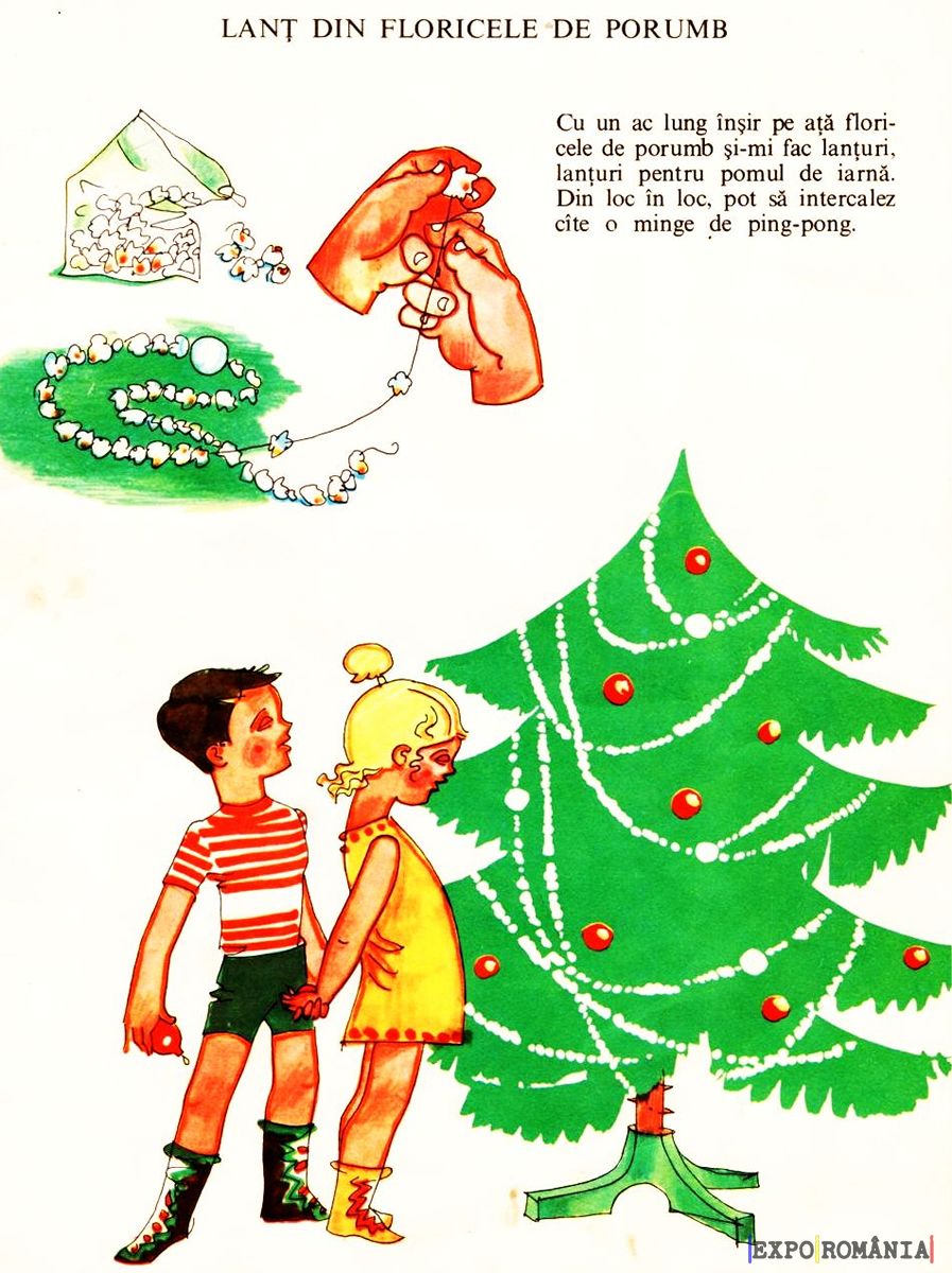 Cu un ac lung înşir pe aţă floricele de porumb şi-mi fac lanţuri, lanţuri pentru pomul de iarnă. Din loc în loc, pot să intercalez cîte o minge de ping-pong.