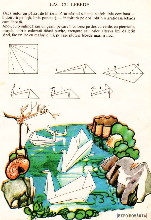Dacă îndoi un pătrat de hirtie albă urmărind schema astfel: linia continuă-îndoitură pe față, linia punctată-îndoitură pe dos, obțin o grațioasă lebădă
