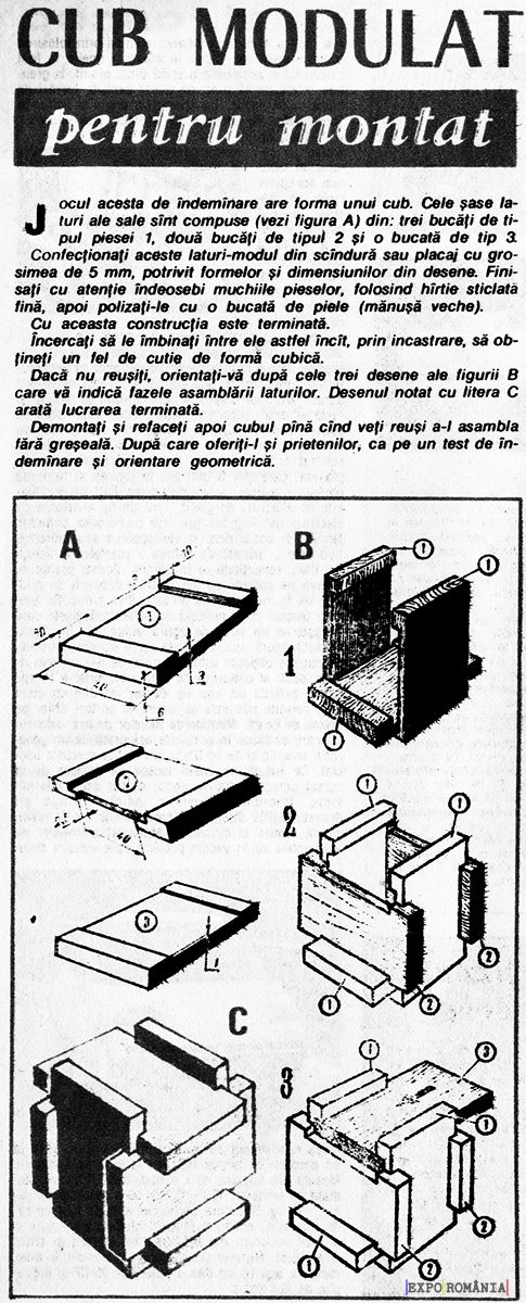 Jocul acesta de îndemînare are forma unui cub. Cele șase laturi ale sale sînt compuse (vezi figura A) din: trei bucăți de tipul piesei 1, două bucăți de tipul 2 și o bucată de tip 3. Confecționați aceste laturi-modul din scîndură sau placaj cu grosimea de 5 mm, potrivit formelor și dimensiunilor din desene. Finisați cu atenție îndeosebi muchiile pieselor, folosind hîrtie sfidată fină, apoi polizați-le cu o bucată de piele (mănușă veche).