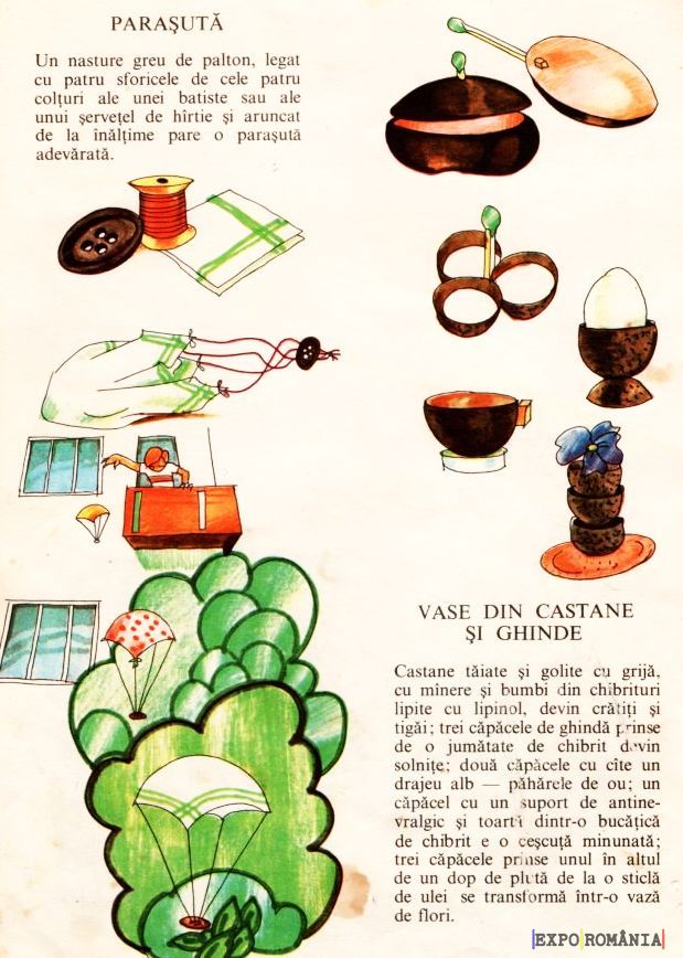 Castane tăiate și golite cu grijă, cu mînere și bumbi din chibrituri lipite cu lipinol, devin crătiți și tigăi; trei căpăcele de ghindă prinse de o jumătate de chibrit devin solnițe; două căpăceie cu cîte un drajeu alb — păhărele de ou; un căpăcel cu un suport de antinevralgic și toartă dintr-o bucățică de chibrit e o ceșcuță minunată; trei căpăcele prinse unul în altul de un dop de plută de la o sticlă de ulei se transformă într-o vază de flori.