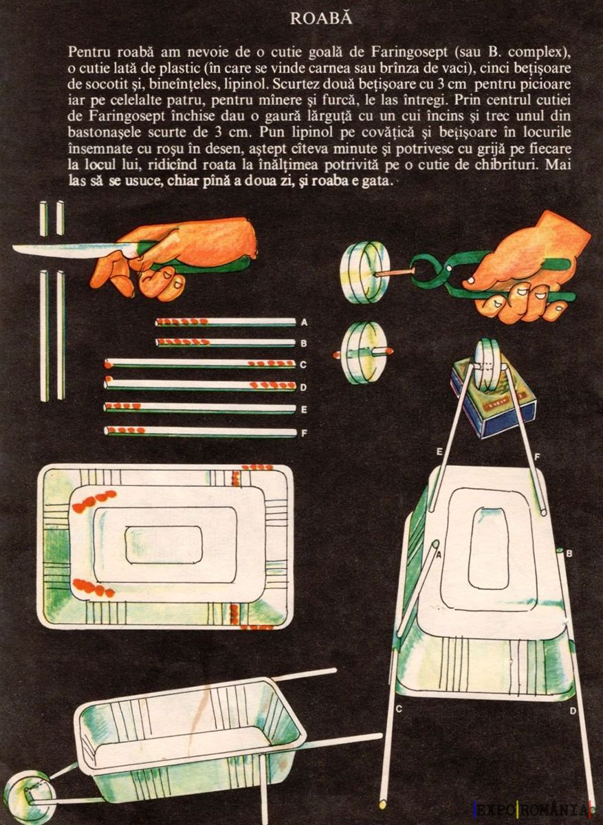 Pentru roabă am nevoie de o cutie goală de Faringosept (sau B. complex), o cutie lată de plastic (în care se vinde carnea sau brînza de vaci), cinci bețișoare de socotit și, bineînțeles, lipinol. Scurtez două bețișoare cu 3 cm pentru picioare iar pe celelalte patru, pentru minere și furcă, le las întregi. Prin centrul cutiei de Faringosept închise dau o gaură lărguță cu un cui încins și trec unul din bastonașele scurte de 3 cm. Pun lipinol pe covățică și bețișoare în locurile însemnate cu roșu în desen, aștept cîteva minute și potrivesc cu grijă pe fiecare la locul lui, ridicînd roata la înălțimea potrivită pe o cutie de chibrituri. Mai las să se usuce, chiar pînă a doua zi, și roaba e gata.