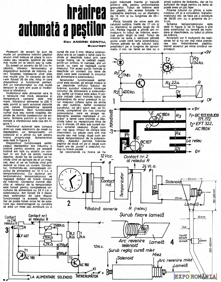 Dispozitivul funcționează astfel: ceasul deșteptător are înăuntru o bobină pentru sonerie; pe această bobină am lipit cu scotch un contact în vid (tub de sticlă) normal deschis. Acest tip de contact se în-chide cînd se apropie de el un magnet, deci el se va închide cînd prin bobină va trece un curent. Contactul, închizîndu-se, completează circuitul de alimentare cu 12 V c.c. a temporizatorului. Cu ajutorul potențiometrului temporizatorului se reglează debitul de hrană (timpul de hrănire). Contactul normal deschis al releului de la temporizator este folosit pentru completarea circuitului de alimentare cu 24 V c.a. a solenoidului. Am folosit 24 V deoarece solenoidul de care dispun funcționează la această tensiune, dar se poate folosi orice fel de solenoid sau electromagnet cu condiția să aibă un miez sau armătură cu o cursă de cca 3 mm. Miezul solenoidului are la un capăt o lamă care închide și deschide tubul prin care curge hrana, iar la celălalt capăt, printr-un orificiu în carcasă, are un șurub cu care se reglează cursa miezului. Tot acest șurub închide și deschide un contact (cu lame de oțel) care este conectat în circuitul de alimentare a solenoidului.
