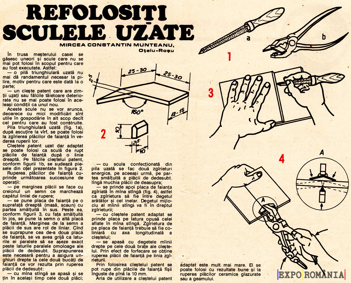 Pila triunghiulară uzată (fig. 1a), după ascuțire la vîrf, se poate folosi la zgîrierea plăcilor de faianță în vederea ruperii lor.