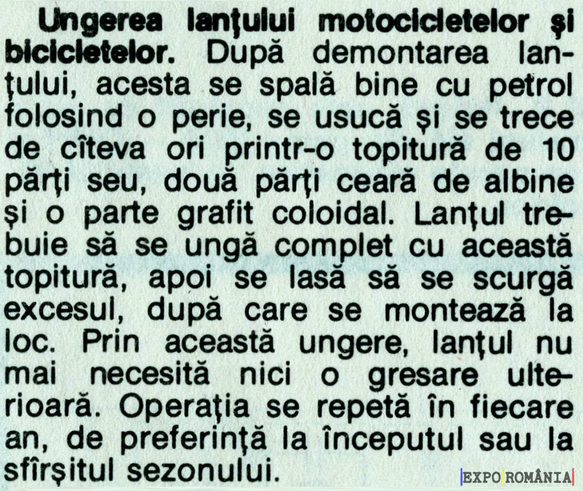 Ungerea lanțului motocicletelor şi bicicletelor. După demontarea lanțului, acesta se spală bine cu petrol folosind o perie, se usucă și se trece de cîteva ori printr-o topitură de 10 părți seu, două părţi ceară de albine și o parte grafit coloidal. Lanţul trebuie să se ungă complet cu această topitură, apoi se lasă să se scurgă excesul, după care se montează la loc. Prin această ungere, lanțul nu mai necesită nici o gresare ulterioară. Operația se repetă în fiecare an, de preferință la începutul sau la sfîrșitul sezonului.