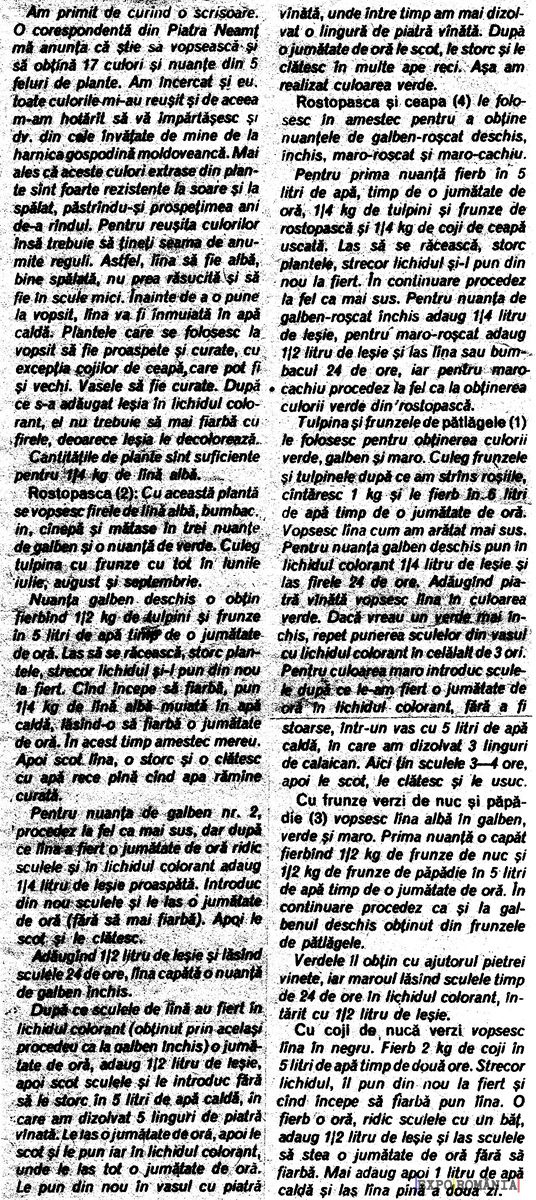 Am primit de curînd o scrisoare. O corespondentă din Piatra Neamț mă anunța că știe sa vopsească și să obțină 17 culori și nuanțe din 5 feluri de plante. Am încercat și eu, toate culorile mi-au reușit și de aceea m-am hotărît să vă împărtășesc și dv. din cele învățate de mine de la harnica gospodină moldoveancă. Mai ales că aceste culori extrase din plante sînt foarte rezistente la soare și la spălat, păstrîndu-și prospețimea ani de-a rîndul. Pentru reușita culorilor însă trebuie să țineți seama de anumite reguli. Astfel, lîna să fie albă, bine spălată, nu prea răsucită și să fie în scule mici. Înainte de a o pune la vopsit, lîna va fi înmuiată în apă caldă. Plantele care se folosesc la vopsit să fie proaspete și curate, cu excepția cojilor de ceapă,care pot fi și vechi. Vasele să fie curate. După ce s-a adăugat leșia în lichidul colorant, el nu trebuie să mai fiarbă cu firele deoarece leșia le decolorează.