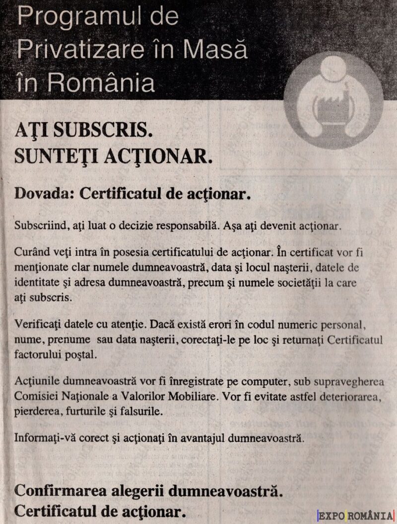 Cârdul veți intra în posesia certificatului de acționar. În certificat vor fi menționate clar numele dumneavoastră, data și locul nașterii, datele de identitate și adresa dumneavoastră, precum și numele societății la care ati subscris.