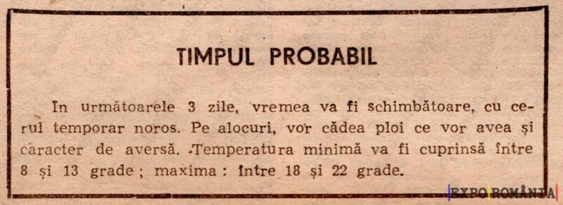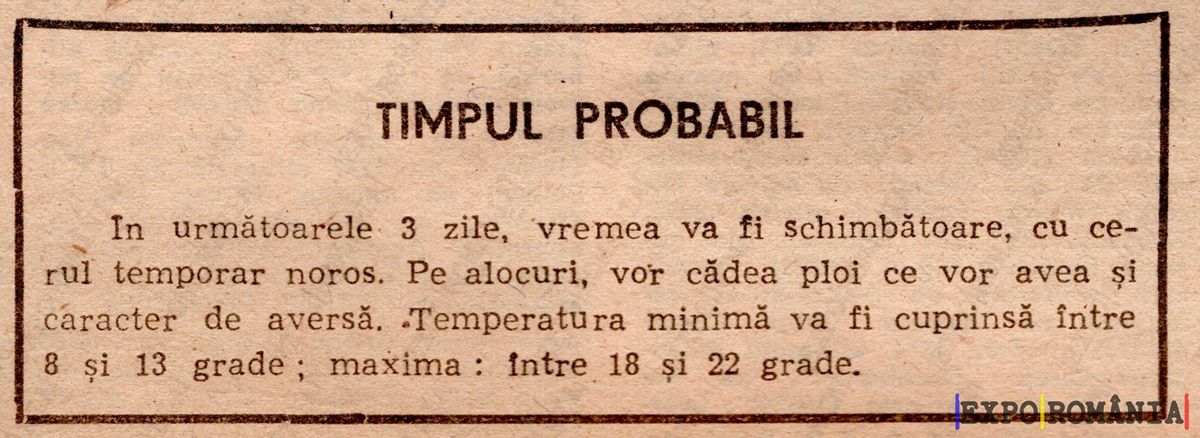 In următoarele 3 zile, vremea va fi schimbătoare, cu cerul temporar noros. Pe alocuri, vor cădea ploi ce vor avea și caracter de aversă. Temperatura minimă va fi cuprinsă între 8 și 13 grade; maxima: între 18 și 22 grade.