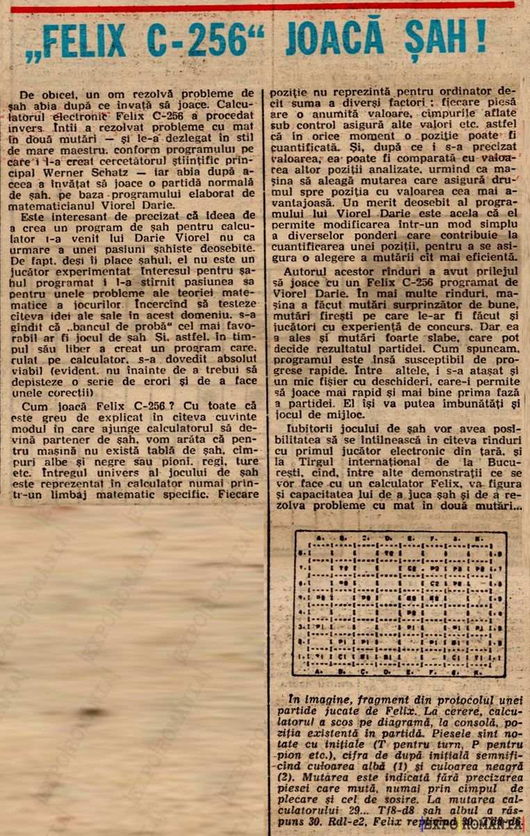 În imagine, fragment din producție atractivă și provocatoare pentru rezultatele jocului de șah, C-256, cel care deschide noi orizonturi în lumea șahului. Este demn de menționat faptul că problema nu este în domeniul tehnologiei, ci în modul în care ea este utilizată pentru a reproduce jocul.