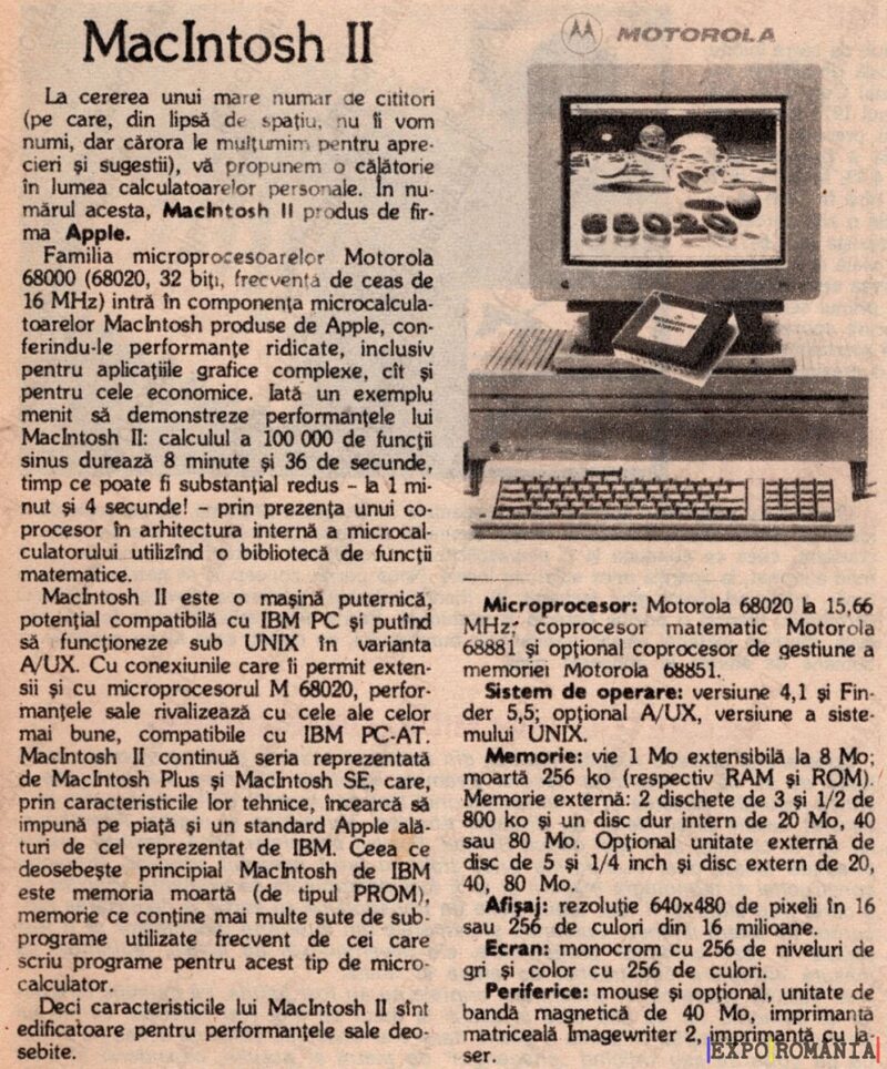 La cererea unui mare număr de cititori (pe care, din lipsă de spațiu, nu o vom numi, dar cărora le mulțumim pentru aprecieri și sugestii), vă propunem o călătorie în lumea calculatoarelor personale. În randul acesta, MacIntosh II produse de firma Apple.