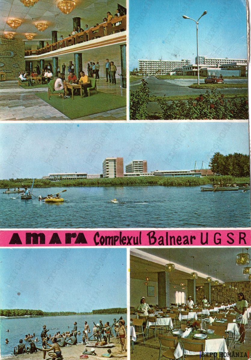Partea inferioară a imaginii prezintă un lac liniștit, cu bărci pe apă și oameni care se bucură de soare pe mal. La stânga, se observă o plajă mică, unde vizitatorii se relaxează. În partea dreaptă, o sală de mese este plină de clienți care servesc masa într-un decor simplu și primitor. Textul „Amara Complexul Balnear U.G.S.R.” este scris într-un font îndrăzneț, evidențiind numele complexului.