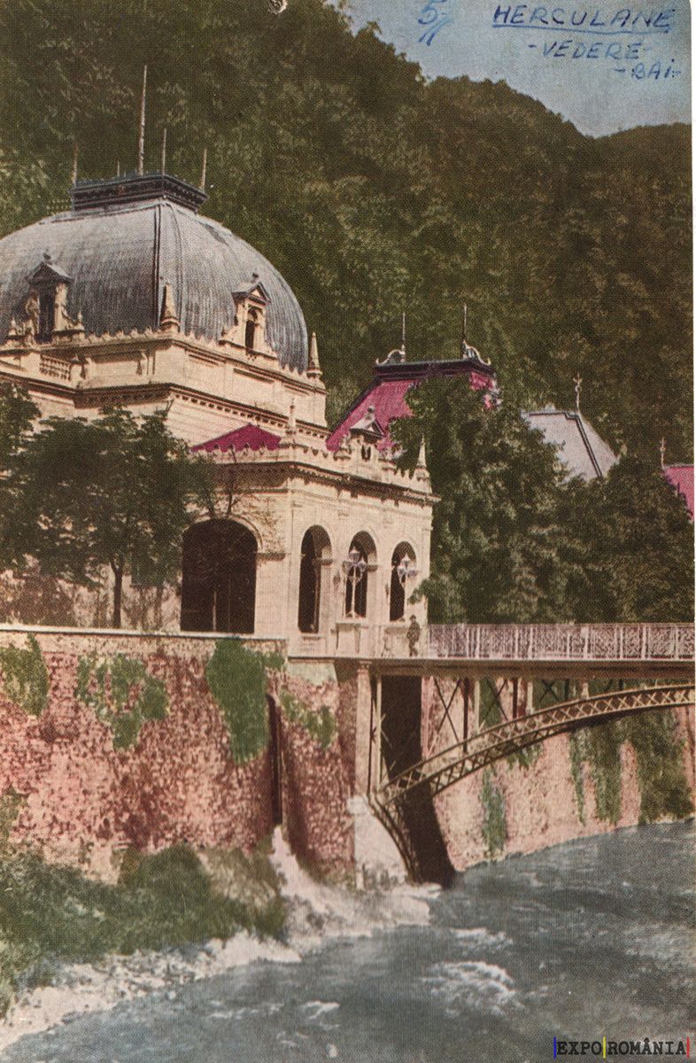 Imaginea reprezintă o carte poștală veche, care ilustrează o clădire elegantă situată pe malul unui râu. Clădirea are un acoperiș rotund și detalii arhitecturale ornate, cu feronerie decorativă. În fața clădirii se află un pod din metal, care traversează apa curgătoare. Pe fundal, se pot observa dealuri împădurite, adăugând un peisaj natural pitoresc. Culoarea imaginii este vibrantă, cu nuanțe de verde și albastru, sugerând o atmosferă liniștită și plăcută. Textul de pe cartea poștală indică locația „Herculane” și sugerează că este o vedere dintr-o zonă turistică.