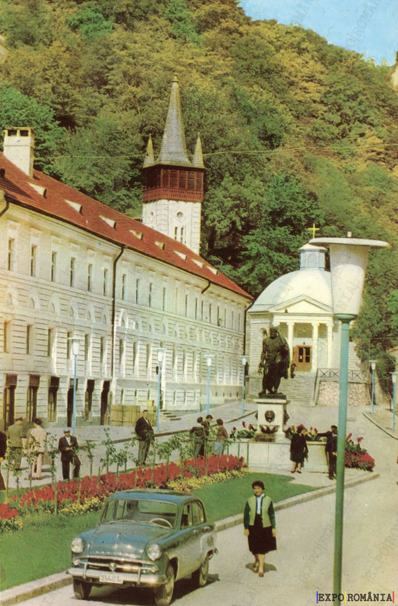 Imaginea prezintă o stradă din București, cu clădiri elegante pe o parte și un peisaj verde pe fundal. O clădire cu un acoperiș înalt și un turn se află în centrul imaginii, înconjurată de copaci. În fața clădirii, se află o statuie, iar în jurul acesteia sunt flori colorate. Pe trotuar, câțiva oameni se plimbă, iar un automobil vintage este parcat pe marginea drumului. Iluminatul stradal este prezent, adăugând o notă de atmosferă urbană.