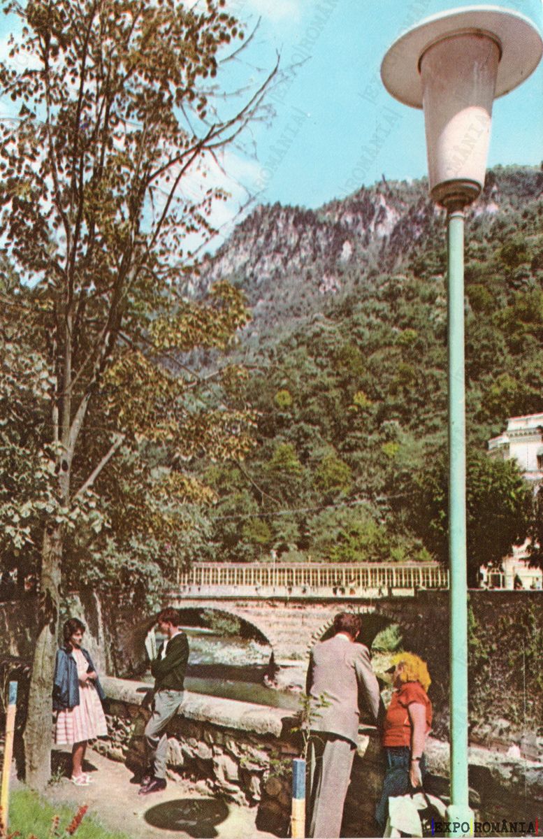 Imaginea reprezintă o scenă din București, surprinsă pe o carte poștală. În prim-plan, se observă un grup de patru persoane, două dintre ele fiind copii. Aceștia stau lângă un pod mic, construit din piatră, care traversează un curs de apă. În fundal, se ridică munți acoperiți de vegetație densă, sugerând un peisaj natural impresionant. Un copac verde se află în apropiere, iar o lampă stradală modernă completează imaginea urbană. Cerul este senin, iar culorile sunt vibrante, evocând o atmosferă plăcută și relaxantă.
