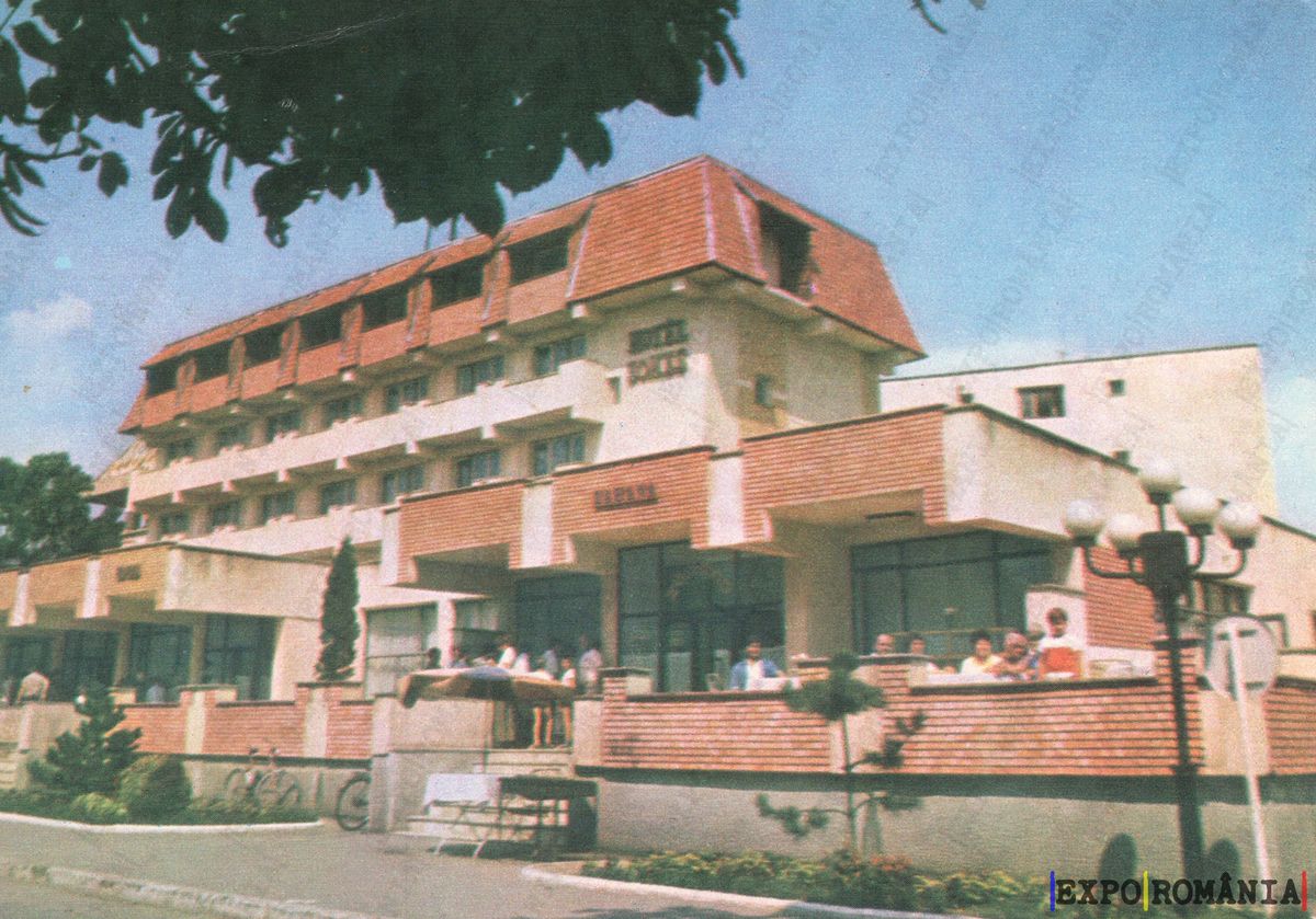 Imaginea prezintă o clădire de tip hotelier din București, cu un design arhitectural specific unei perioade anterioare. Fațada este compusă dintr-un amestec de cărămidă și elemente de sticlă, având un aspect modern pentru vremea sa. Acoperișul este înclinat, cu țiglă roșie, iar la parter se află feronerie de sticlă care oferă o vedere deschisă. În fața clădirii, se pot observa câteva persoane așezate la mese, sugerând o atmosferă de relaxare. În jurul clădirii sunt plante și copaci, iar pe trotuar sunt amplasate lămpi decorative. Cerul este senin, ceea ce contribuie la o impresie generală de lumină și căldură.