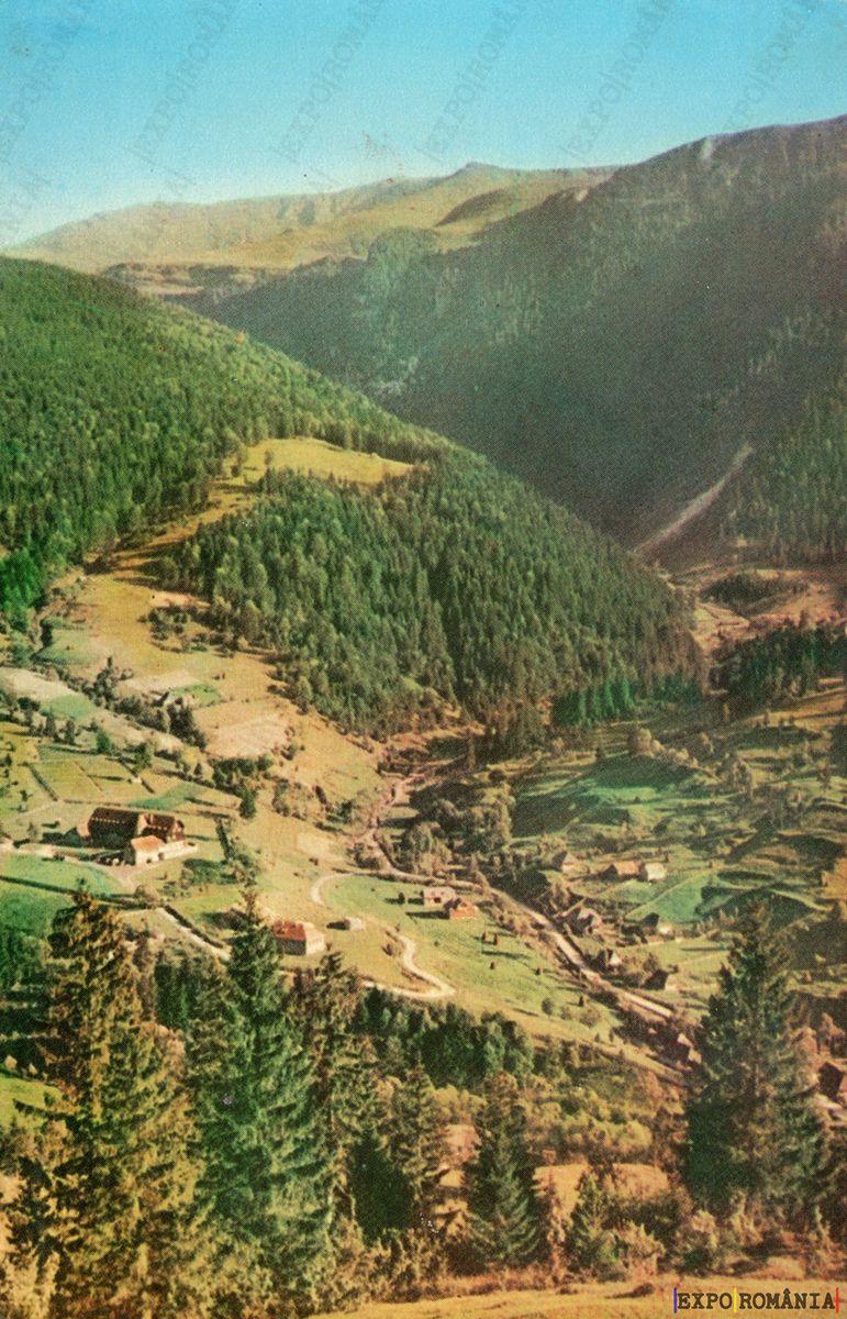 Imaginea prezintă un peisaj montan, cu dealuri acoperite de păduri de conifere. În prim-plan, se observă o vale verde, cu câteva case răsfirate și terenuri agricole. Râuri sau pârâuri curg printre coline, iar în fundal se ridică munți impunători, acoperiți parțial de vegetație. Cerul este senin, iar lumina soarelui conferă o atmosferă caldă și plăcută întregului peisaj. Această imagine evocă o senzație de liniște și frumusețe naturală.