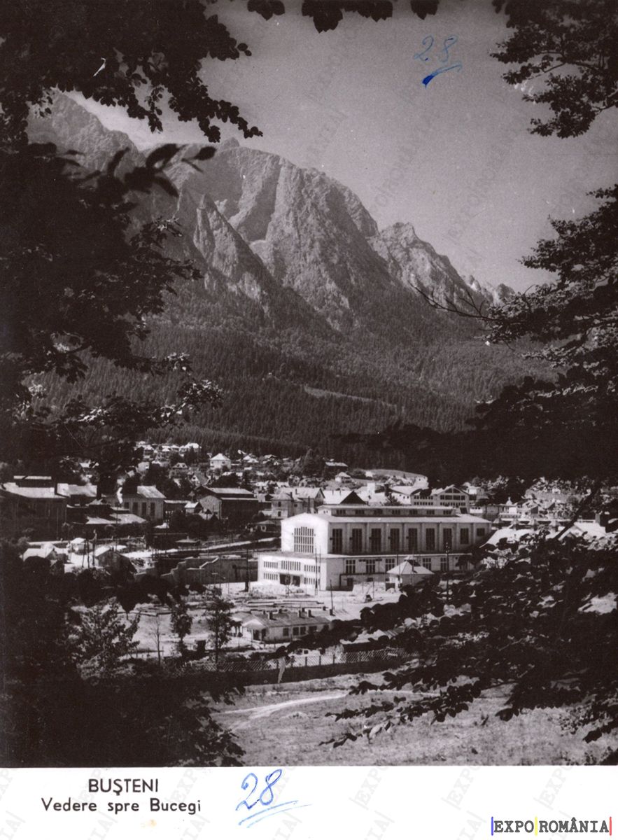 Imaginea prezintă o vedere panoramică a localității Bușteni, cu un peisaj montan impresionant în fundal. Munții Bucegi se ridică majestuos, cu vârfuri stâncoase și acoperiți parțial de vegetație. În prim-plan, se observă o așezare urbană, cu clădiri și case, evidențiind arhitectura specifică zonei. Cerul este senin, iar atmosfera generală sugerează o zi liniștită în natură. Sub imagine, textul indică numele localității și descrierea peisajului. Tonurile sunt predominant alb-negru, conferind un aspect nostalgic.