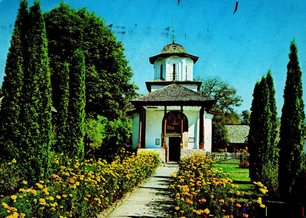 Imaginea prezintă o carte poștală din București, evidențiind o clădire tradițională cu un acoperiș din țiglă, specific arhitecturii românești. În fața clădirii se află un drum pavat, flancat de flori de galben strălucitor, care adaugă o notă de culoare și vitalitate peisajului. De o parte și de alta a căii se înalță arbori verzi, creând un cadru natural plăcut. Cerul este senin, iar lumina soarelui accentuează detaliile arhitecturale ale clădirii și frumusețea florilor. Această imagine evocă o atmosferă de liniște și tradiție, specifică locurilor istorice din București.