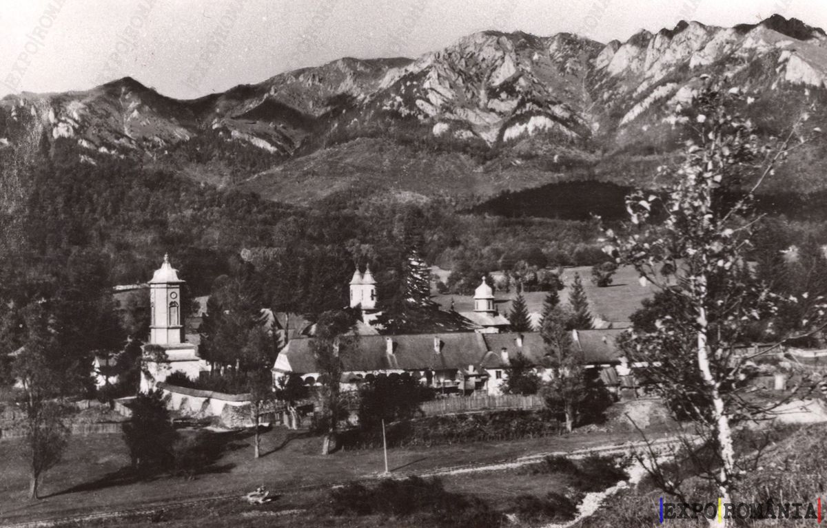 Imaginea prezintă un peisaj montan, cu vârfuri stâncoase acoperite de vegetație. În prim-plan, se află un complex arhitectural, posibil un mănăstire sau o clădire istorică, cu turnuri și acoperișuri înclinate. Împrejurimile sunt dominate de copaci și o zonă verde, sugerând un mediu natural liniștit. Calea care se desfășoară în fața clădirii pare să conducă spre munți, creând o atmosferă de serenitate și frumusețe naturală. Imaginea are un aspect vintage, cu tonuri sepia, evocând o senzație de nostalgie.