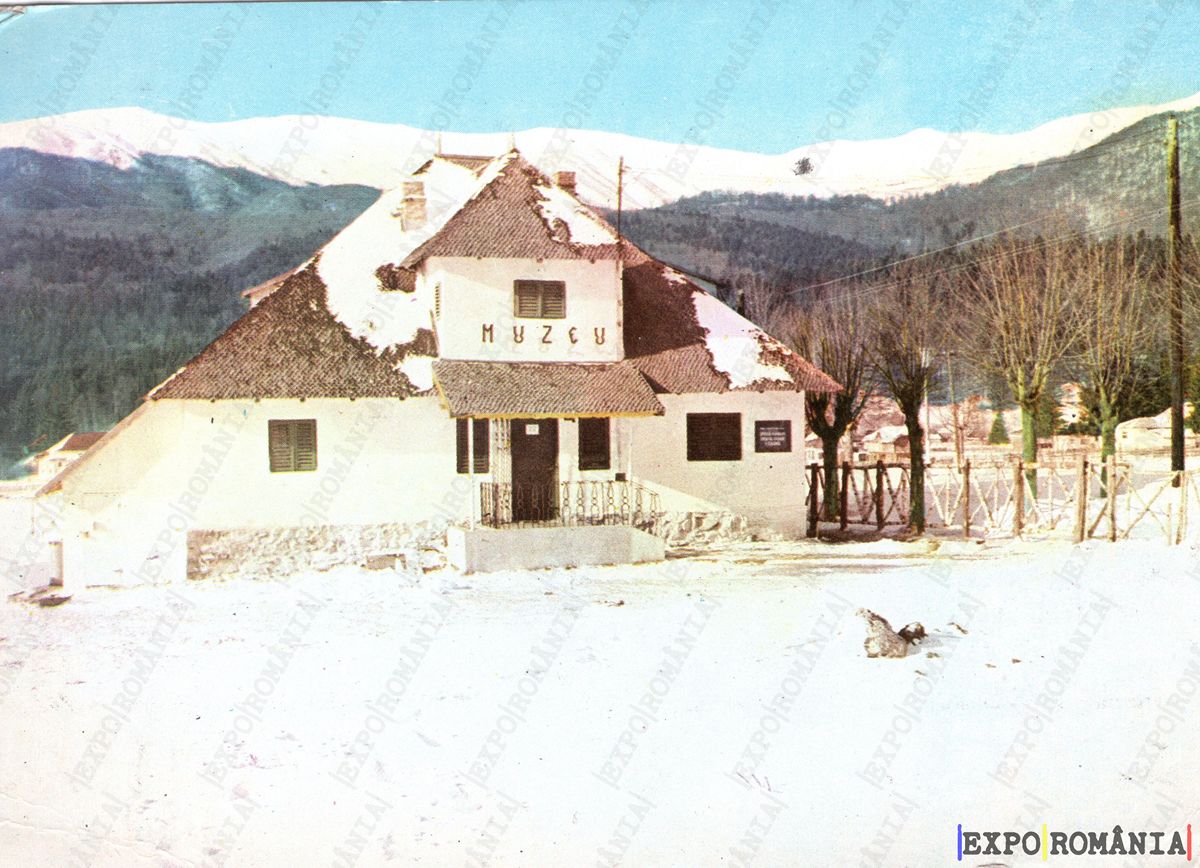 Imaginea prezintă o clădire cu un acoperiș din țiglă, situată într-un peisaj montan acoperit de zăpadă. Fațada clădirii este albă, iar pe fronton se află inscripția „MUZEU”. În jurul clădirii, se pot observa copaci fără frunze, iar în fundal se ridică munți acoperiți de zăpadă. Atmosfera generală sugerează o zi rece de iarnă, cu un cer senin și lumina soarelui reflectându-se pe zăpadă. Clădirea este înconjurată de un gard simplu, iar în fața acesteia se află o porțiune de zăpadă neatinsă.