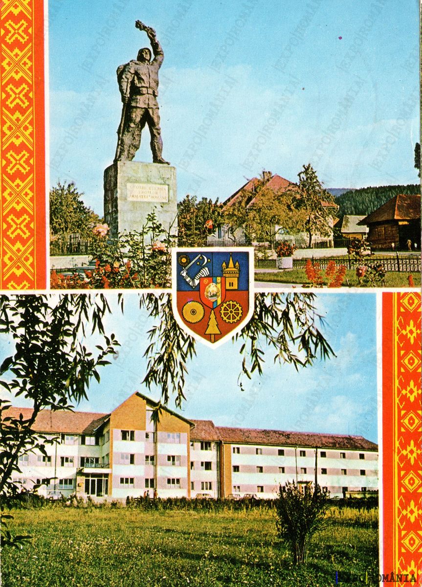 Partea inferioară a cărții poștale ilustrează un complex de clădiri moderne, cu un design simplu, având feronerie albă și acoperișuri de culoare roșie. În fața clădirii se întinde o fâneață verde, care adaugă un contrast plăcut imaginii. La mijlocul cărții poștale se află un scut heraldic, care include simboluri reprezentative pentru oraș.