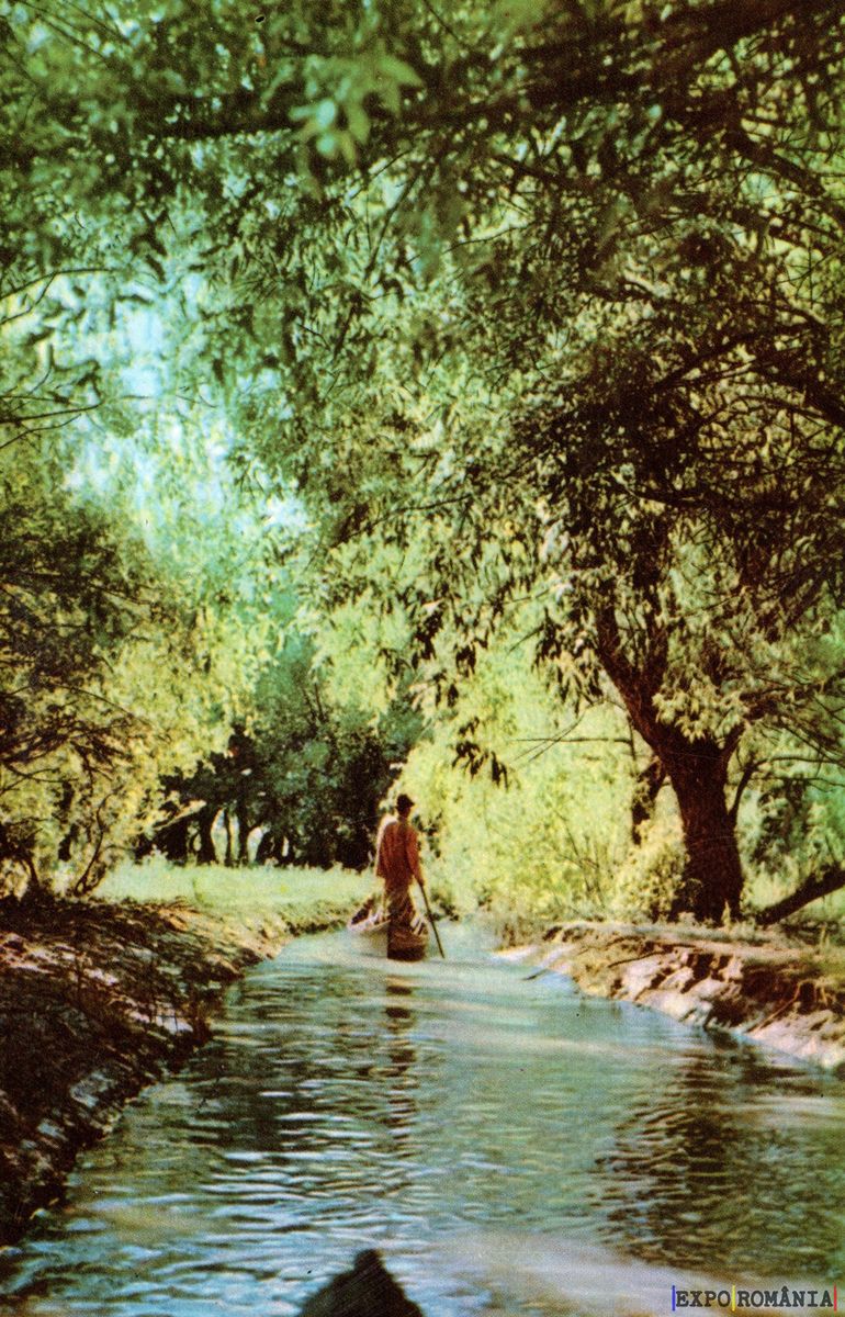 Imaginea prezintă un peisaj natural din București, cu un canal de apă ce curge liniștit printre copaci. Vegetația este abundentă, cu ramuri verzi și frunze dense care oferă o umbră plăcută. În fundal, se observă o persoană care pășește prin apă, sugerând o atmosferă de calm și relaxare. Lumina soarelui filtrează printre frunzele copacilor, creând un joc de lumini și umbre pe suprafața apei. Peisajul evocă o senzație de liniște și conexiune cu natura.