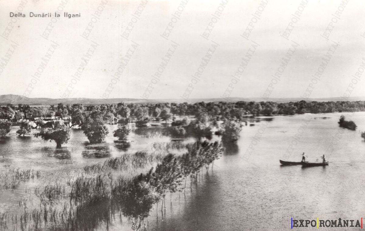 Imaginea reprezintă o vedere panoramică a Deltei Dunării, în zona Ilganii. Peisajul este dominat de ape liniștite, cu o vegetație bogată de stuf și copaci care se reflectă în apă. În prim-plan, se observă o barcă mică cu doi pescari, care navighează pe râu. Fundalul este marcat de coline ușoare și o cer senin, sugerând o atmosferă de liniște și natură sălbatică. Detaliile arhitecturale ale satului din apropiere sunt vizibile, adăugând un element uman peisajului natural. Imaginea evocă frumusețea și biodiversitatea regiunii.