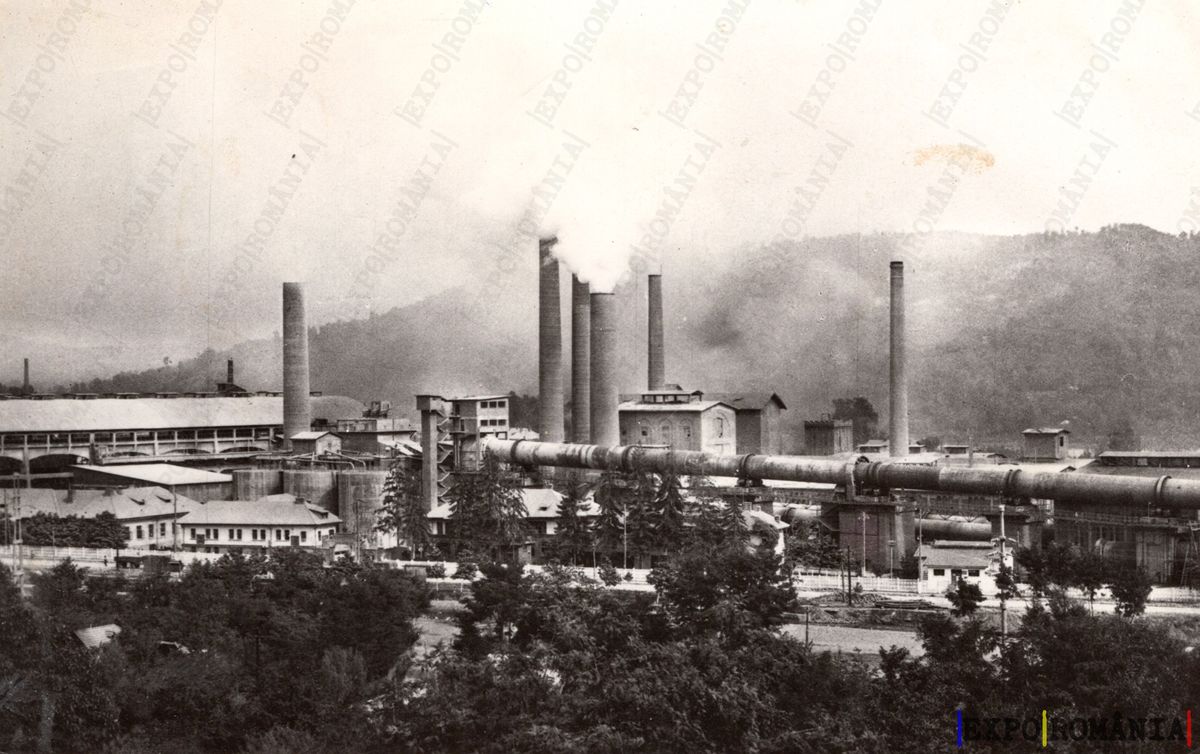 Imaginea reprezintă o fabrică industrială, cu un peisaj urban în fundal. Se observă mai multe chiminee înalte care emană fum, sugerând activitate industrială intensă. Clădirile sunt construite din materiale solide, iar arhitectura reflectă stilul industrial al vremii. În jurul fabricii, se află o zonă verde cu copaci, care contrastează cu structurile metalice și betoanele. Cerul este acoperit de nori, ceea ce adaugă o atmosferă sumbră imaginii. Această scenă ilustrează dezvoltarea industrială a Bucureștiului în perioada respectivă.
