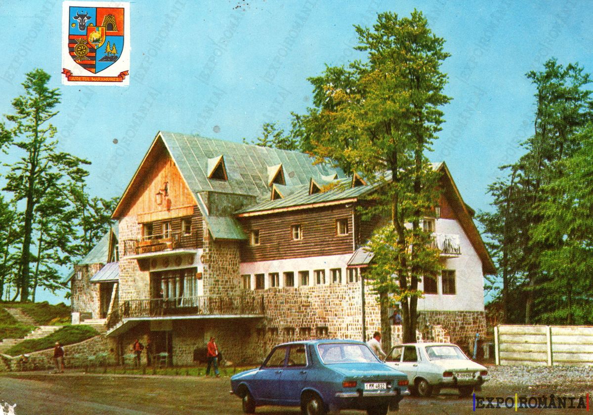 Imaginea prezintă o clădire de tip pensiune sau cabană, situată într-un peisaj natural, înconjurată de copaci verzi. Arhitectura clădirii combină elemente tradiționale cu detalii moderne, având un acoperiș în două ape și fațade din piatră și lemn. În fața clădirii se află o zonă de parcare cu câteva mașini, iar pe aleea din față sunt vizibile câteva persoane care se deplasează. Cerul este senin, iar atmosfera generală sugerează un loc liniștit, ideal pentru relaxare. În colțul din stânga sus se află un blazon sau siglă, care ar putea indica apartenența localității sau a instituției respective.