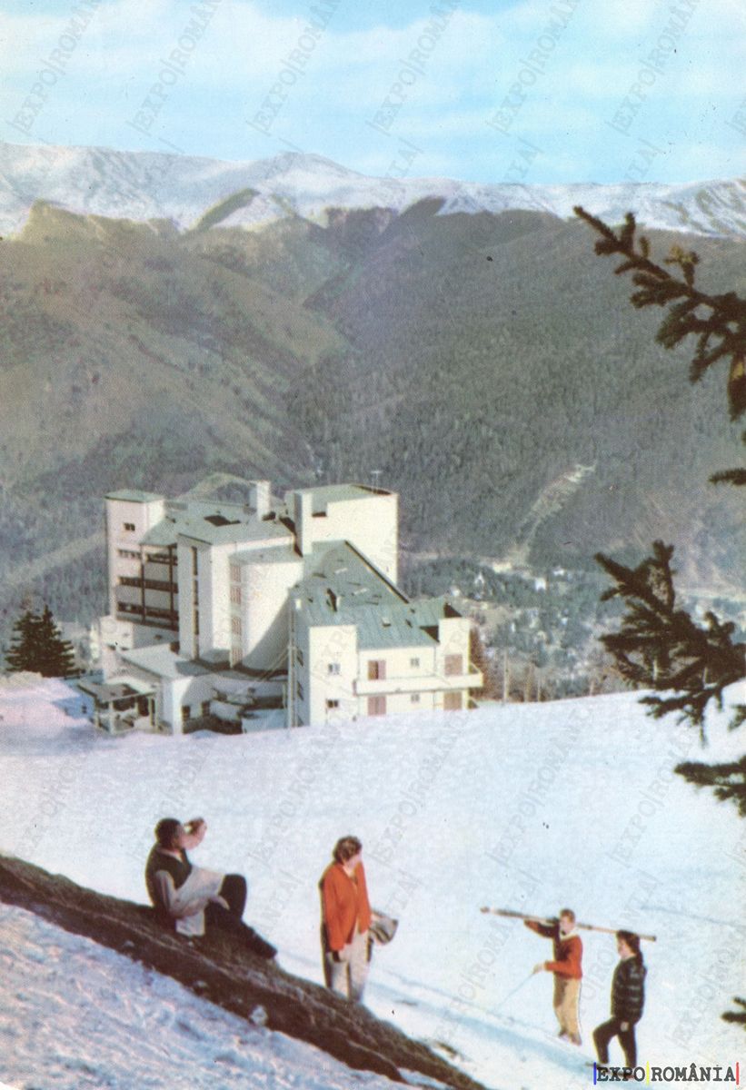 Imaginea prezintă un peisaj montan acoperit de zăpadă, cu un hotel sau o clădire modernă situată în partea de jos a imaginii. În prim-plan, se află câțiva oameni îmbrăcați în haine de iarnă, unii stând pe o piatră, iar alții pregătindu-se să schieze sau să se plimbe. Fundalul este dominat de munți acoperiți cu zăpadă, iar cerul este parțial noros, sugerând o zi rece de iarnă. Peisajul transmite o atmosferă de liniște și frumusețe naturală.