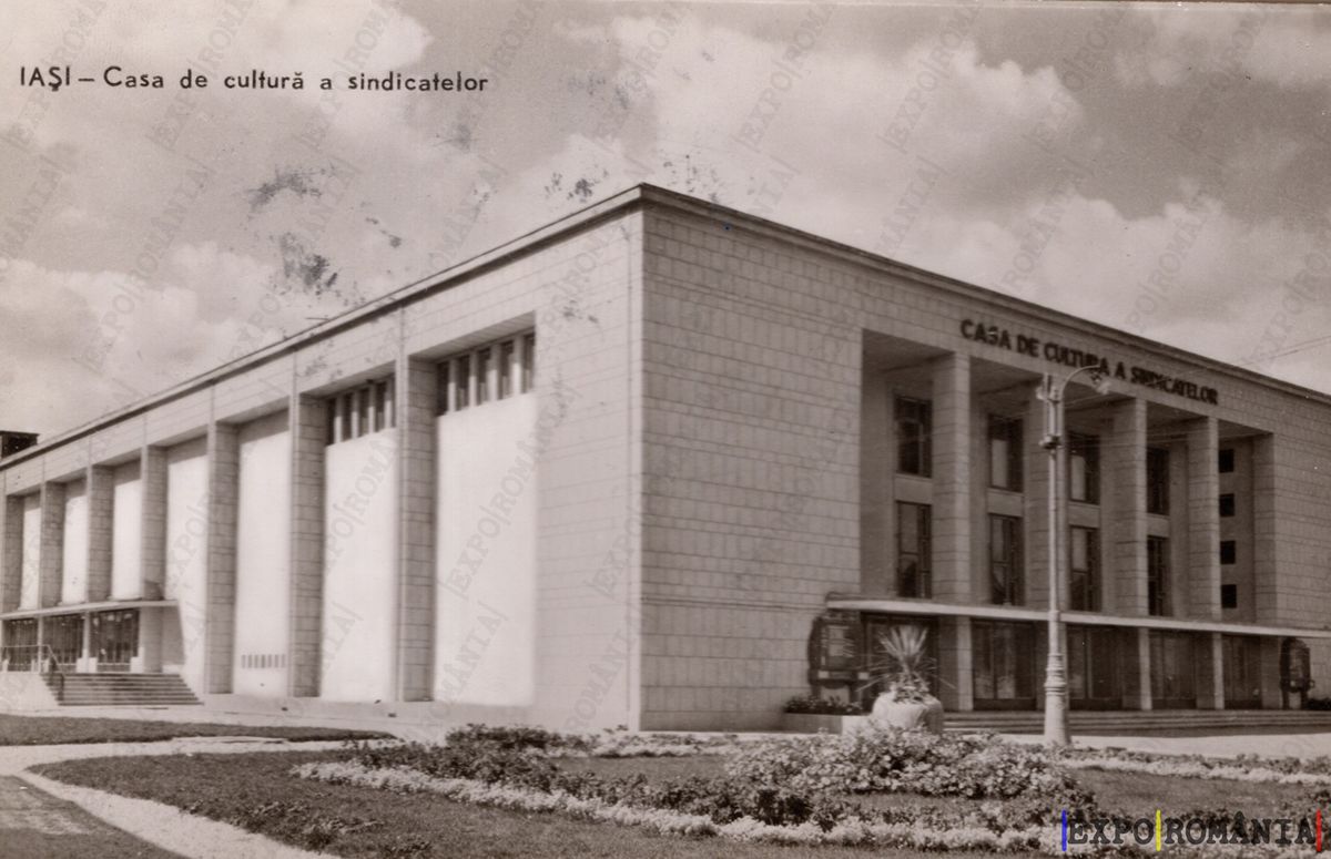 Imaginea prezintă o clădire impunătoare, cunoscută sub numele de Casa de Cultură a Sindicatelor, situată în București. Arhitectura este modernistă, cu linii clare și un aspect geometric. Fațada este realizată din piatră, având feronerie metalică și feronerie de sticlă. Clădirea dispune de feronerie mare, care permite luminii naturale să pătrundă în interior. În fața clădirii se află un spațiu verde, cu iarbă bine întreținută și câteva plante ornamentale. Cerul este parțial noros, iar atmosfera generală sugerează o zi liniștită. Pe clădire se află inscripția „Casa de Cultură a Sindicatelor”, evidențiind funcția culturală a acestei instituții.