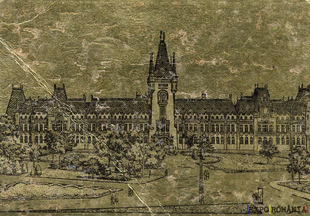 Imaginea reprezintă o carte poștală veche din București, ilustrând o clădire impunătoare cu un stil arhitectural distinct. Fațada clădirii este decorată cu detalii elaborate, iar turnul central se înalță cu un ceas vizibil. În jurul clădirii, se află un parc cu copaci și alei, unde se pot observa câțiva oameni plimbându-se. Fundalul este dominat de un ton aurie, sugerând o atmosferă nostalgic și istorică. Detaliile arhitecturale și peisajul urban contribuie la farmecul acestei imagini reprezentative pentru capitala României.