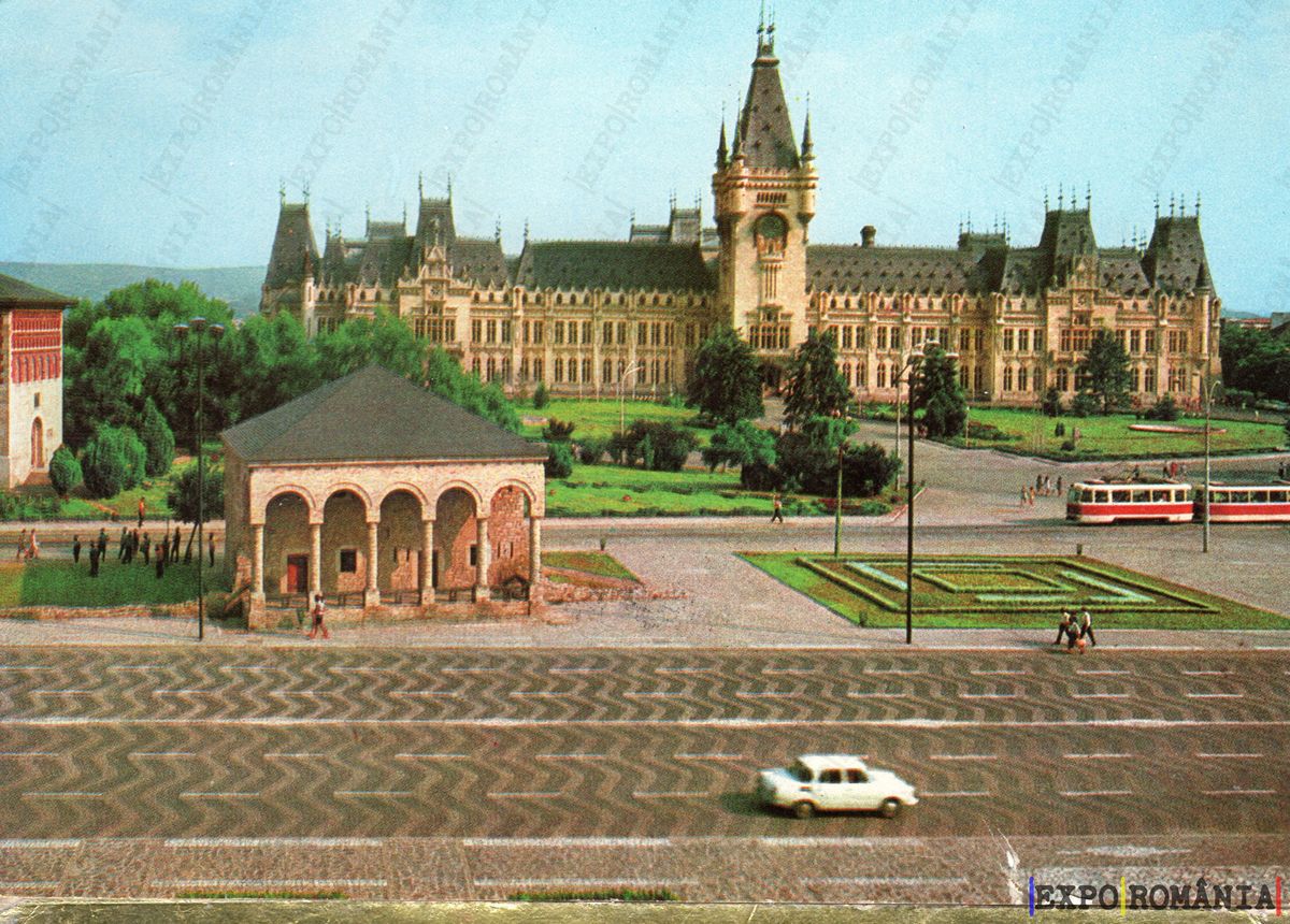 Imaginea prezintă o vedere panoramică a unui peisaj urban din București, cu un accent pe o clădire impunătoare, care pare a fi un palat sau un castel, având turnuri și detalii arhitecturale elaborate. În prim-plan, se află o clădire mai mică, cu arcade, care adaugă un contrast interesant. Pe stradă, se observă o mașină albă care circulă, iar în fundal se pot vedea tramvaie și oameni care se plimbă. Spațiile verzi din jurul clădirilor contribuie la atmosfera plăcută a zonei. Cerul este senin, iar culorile sunt vii, sugerând o zi frumoasă.