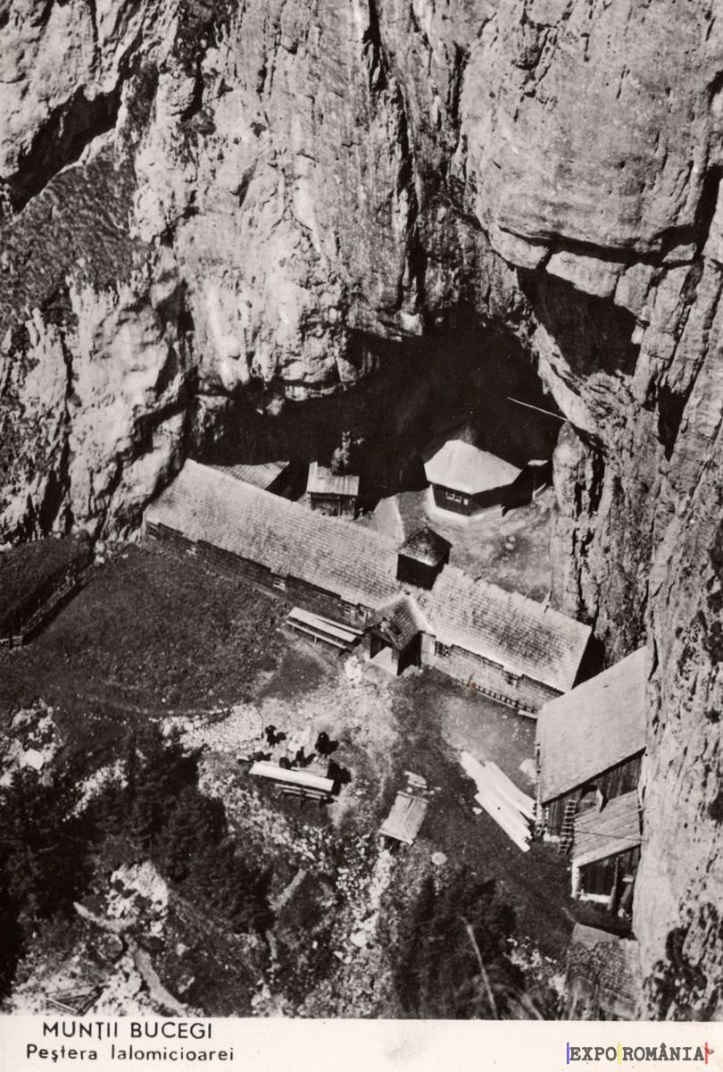 Imaginea prezintă o vedere aeriană a Peșterii Ialomiței, situată în Munții Bucegi. În centrul imaginii se află un complex de clădiri, probabil destinate vizitatorilor sau activităților religioase, înconjurate de stânci abrupte și vegetație montană. Peisajul este dramatic, cu pereți de piatră care se ridică vertical, iar zona din jur pare să fie puțin accesibilă. În partea de jos a imaginii, se observă căi de acces și câteva structuri din lemn, care sugerează o zonă turistică. Textul de pe imagine indică numele locului și specificația peșterii.