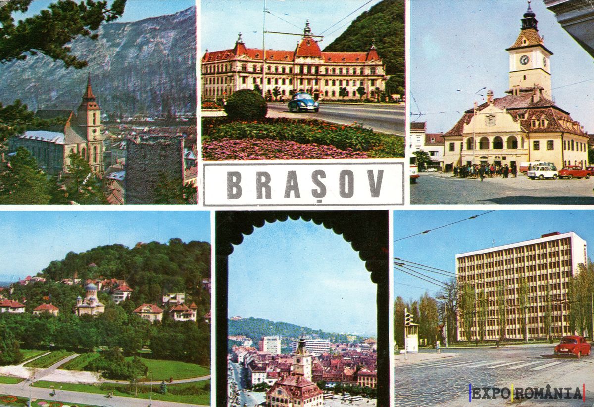 Imaginea reprezintă o carte poștală cu mai multe fotografii din Brașov, România. În colțul din stânga sus se află o biserică, iar în fundal se observă munți. În colțul din dreapta sus este un turn cu ceas, înconjurat de clădiri istorice. Partea centrală a imaginii conține un peisaj urban cu flori și o mașină albastră. În colțul din stânga jos se văd case pitorești, iar în dreapta jos este o clădire modernă. În mijlocul imaginii, cuvântul „BRAȘOV” este scris clar, evidențiind orașul ca destinație turistică.