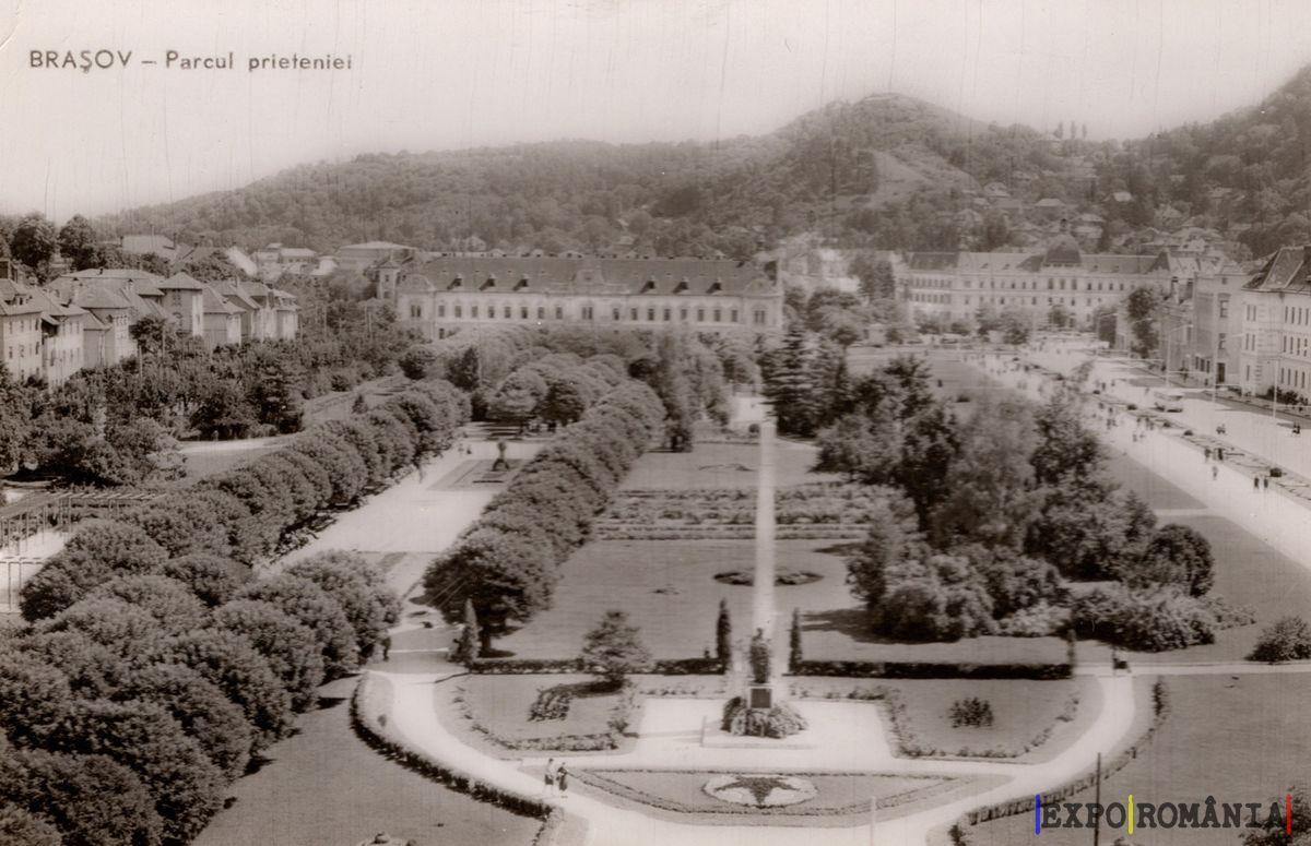 Imaginea reprezintă o carte poștală vintage a orașului Brașov, evidențiind Parcul Prieteniei. În prim-plan se află un parc bine întreținut, cu alei îngrijite și aranjamente florale simetrice. O fântână centrală este vizibilă, înconjurată de plante decorative. Pe fundal, se pot observa clădiri istorice și dealuri verzi, care completează peisajul urban. Cerul este luminos, iar atmosfera generală sugerează o zi plăcută de primăvară sau vară, ideală pentru plimbări în natură.