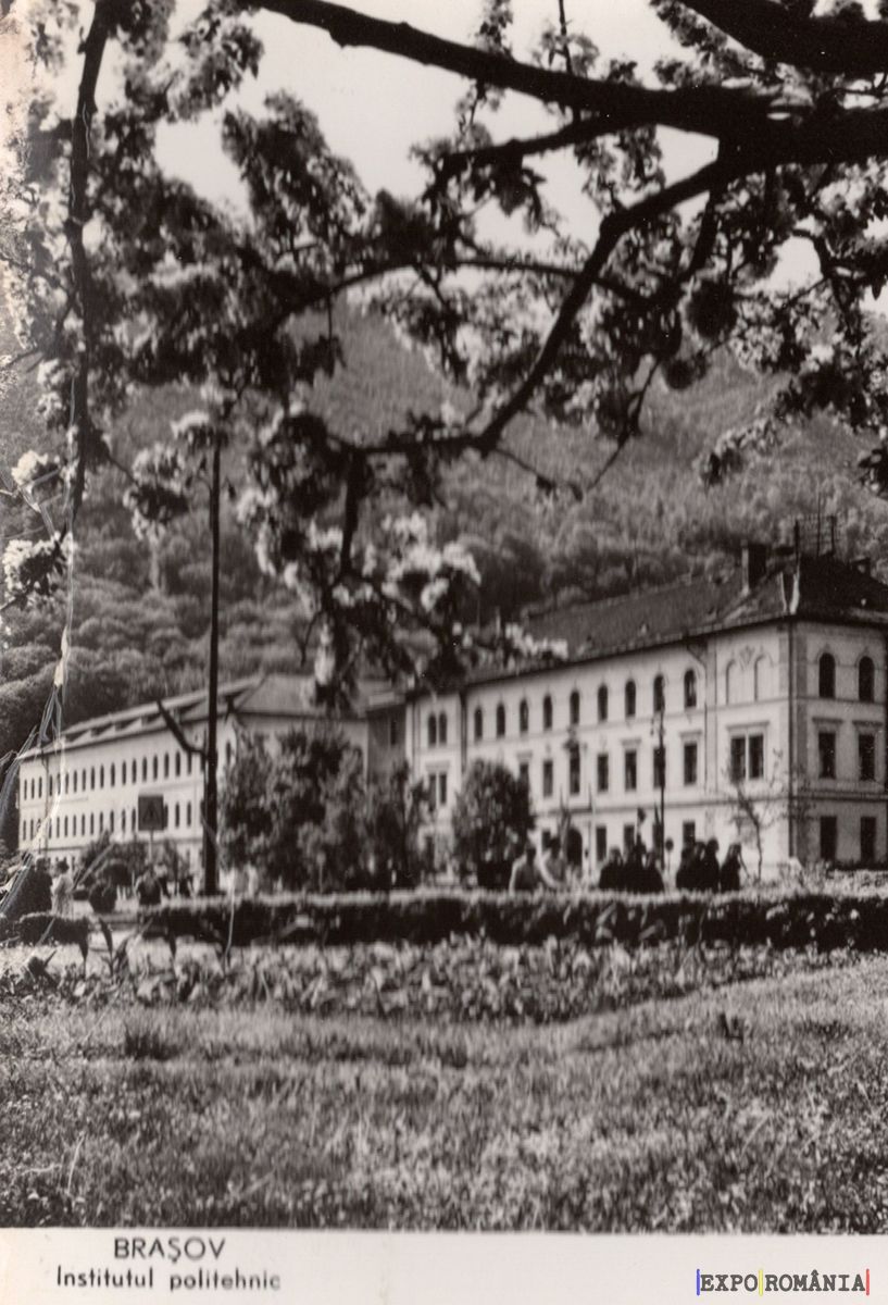 Imaginea reprezintă o carte poștală în alb-negru, care surprinde o clădire impunătoare a unui institut politehnic situat în Brașov. Clădirea are un design arhitectural clasic, cu feronerie detaliată și feronerie la feronerie. În fața clădirii se află o zonă verde, cu plante și arbuști, care adaugă un contrast plăcut cu structura de piatră. În fundal, se observă dealuri acoperite de vegetație, sugerând un peisaj montan. O ramură de copac se întinde în partea superioară a imaginii, aducând un element natural în compoziție. Textul de pe cartea poștală indică locația și denumirea instituției.