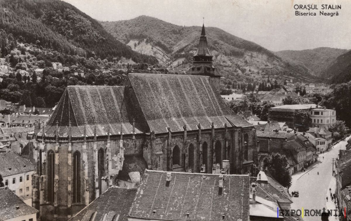 Imaginea reprezintă o carte poștală în alb-negru, având ca subiect principal Biserica Neagră, situată în orașul Brașov, cunoscut anterior sub numele de Orașul Stalin. Biserica, cu arhitectura sa gotică distinctivă, se află în prim-plan, evidențiind detalii precum feroneria și feroneria de pe acoperiș. În fundal, se pot observa colinele împădurite care încadrează orașul, creând un peisaj montan pitorească. Străzile din jurul bisericii sunt populate cu clădiri de epocă, iar atmosfera generală sugerează o perioadă istorică specifică. Textul din colțul superior al imaginii indică denumirea orașului și a bisericii.