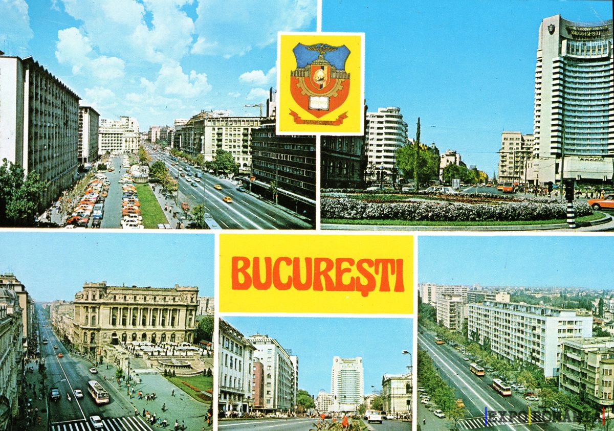 Imaginea reprezintă o carte poștală din București, evidențiind diverse aspecte ale orașului. În centrul imaginii se află un colaj cu patru fotografii, fiecare surprinzând diferite zone ale capitalei.