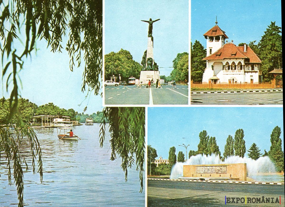 Imaginea reprezintă o carte poștală din București, compusă din patru colaje. În partea stângă, se observă o scenă liniștită pe apă, cu o barcă mică și copaci care se reflectă în luciul apei. În centrul imaginii se află un monument impunător, cu o statuie care pare să simbolizeze un erou sau un lider. În colțul din dreapta sus, se află o clădire cu arhitectură tradițională, având un acoperiș înclinat și detalii decorative. În colțul din dreapta jos, se poate observa o fântână arteziană care împrăștie apă în aer, înconjurată de arbori verzi. Fundalul este dominat de un cer senin, de un albastru vibrant.