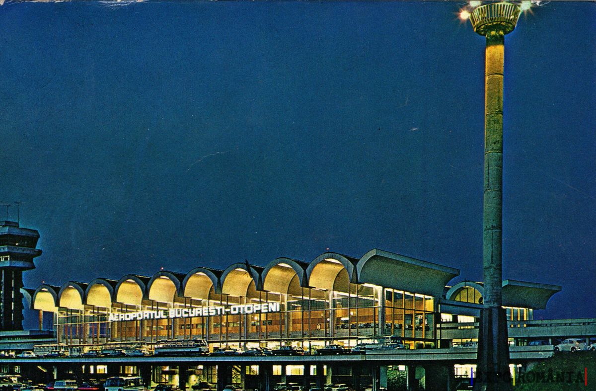 Imaginea prezintă Aeroportul București-Otopeni, surprins pe timp de noapte. Clădirea are un design modern, cu o fațadă iluminată care evidențiază forma sa distinctivă, cu acoperișuri ondulate. Pe clădire se află inscripția „AEROPORTUL BUCUREȘTI-OTOPENI”, bine vizibilă datorită iluminării. În prim-plan, se pot observa stâlpi de iluminat și o parte din infrastructura aeroportului, inclusiv un turn de control. Cerul este întunecat, ceea ce accentuează lumina artificială a clădirii și atmosfera vibrantă a aeroportului.