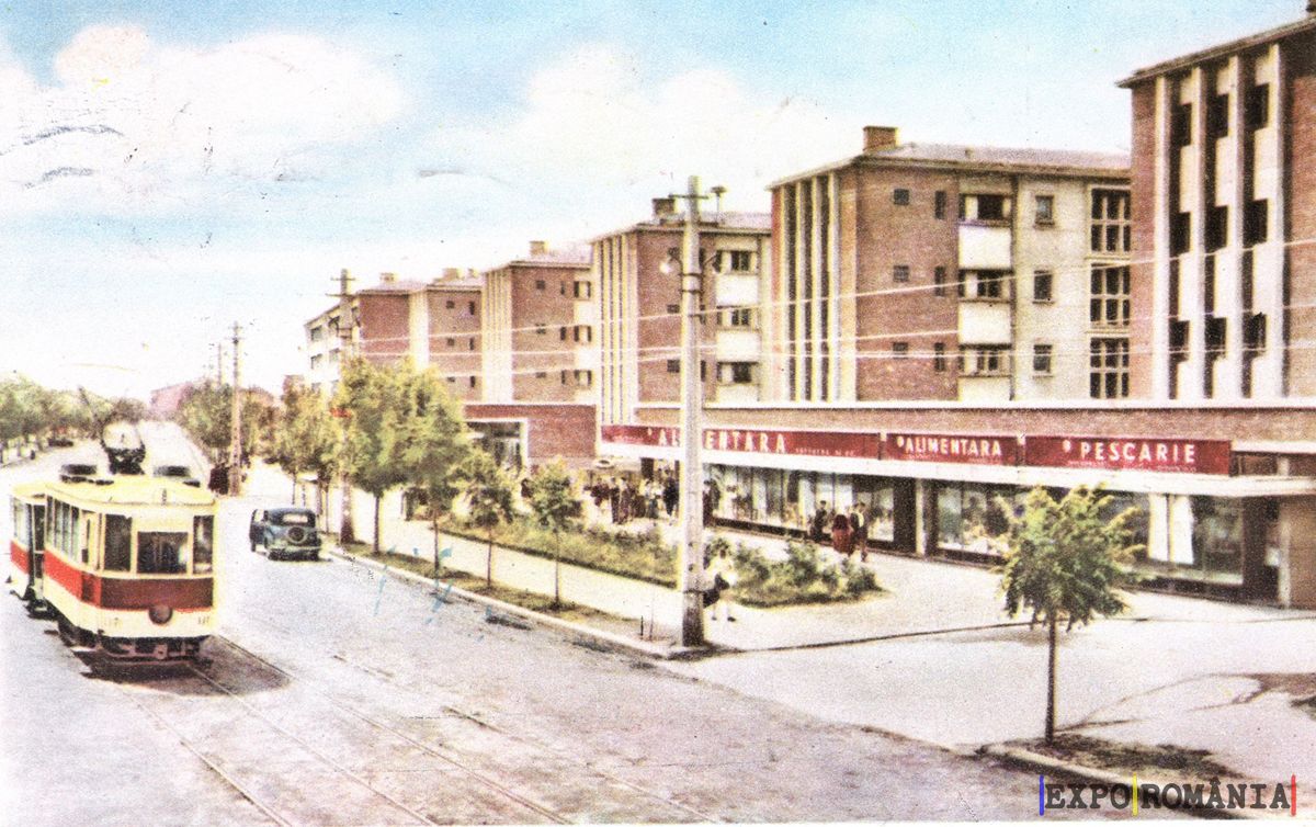 Imaginea reprezintă o carte poștală din București, surprinzând o stradă animată. În prim-plan, se află un tramvai colorat, care circulă pe o linie ferată. Pe partea dreaptă, se observă un magazin cu vitrine mari, având inscripții care sugerează că oferă produse alimentare și pește. Clădirile din fundal sunt de tip rezidențial, cu arhitectură specifică perioadei comuniste, având feronerie simplă și balcoane. Pe stradă, se pot observa câteva mașini parcate și oameni care se plimbă, iar vegetația din jur adaugă un strop de verdeață peisajului urban. Cerul este senin, sugerând o zi frumoasă.