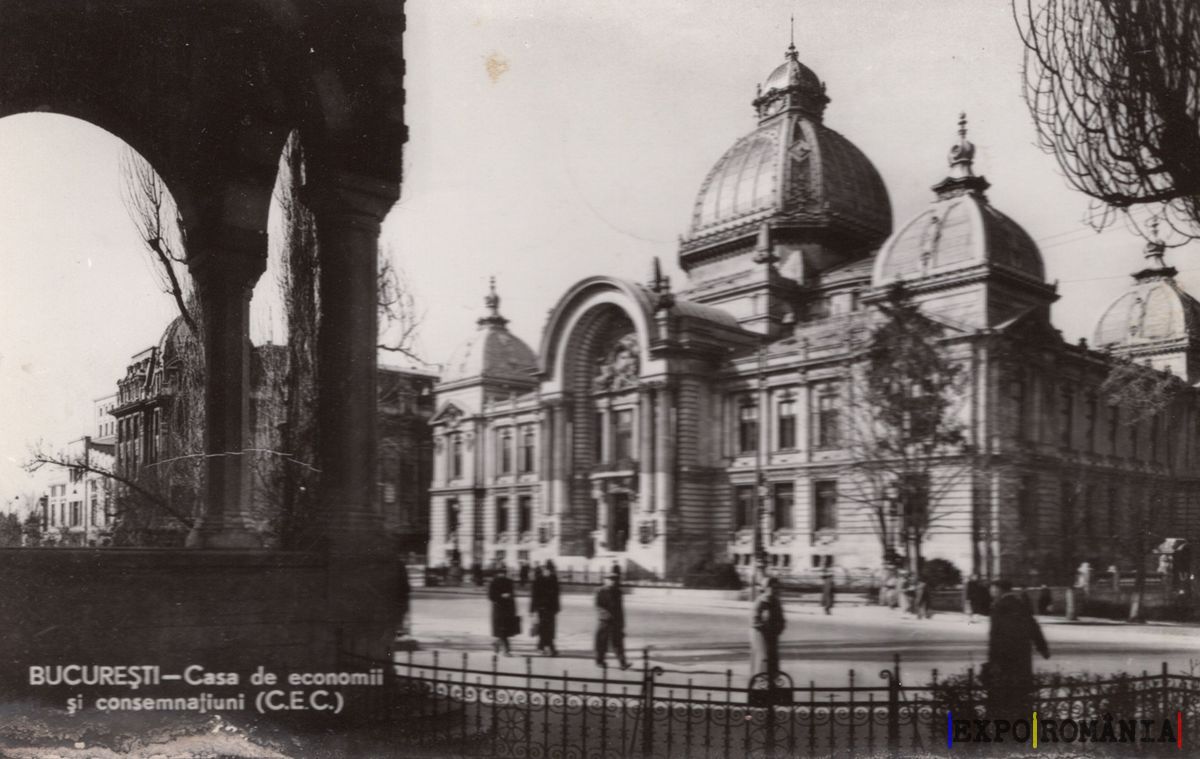 Imaginea reprezintă o carte poștală veche din București, evidențiind clădirea Casa de Economii și Consemnațiuni (C.E.C.). Clădirea, cu arhitectură impunătoare, se remarcă prin cupolele sale elegante și detaliile ornamentale. În prim-plan, se observă un arc de piatră care oferă o perspectivă asupra străzii, unde se află câțiva pietoni. Pe fundal, se poate observa vegetația de pe marginea drumului, iar atmosfera generală sugerează o zi liniștită din trecut. Imaginea este în tonuri de alb și negru, accentuând caracterul nostalgic al scenei. Textul de pe cartea poștală indică locația și denumirea clădirii.