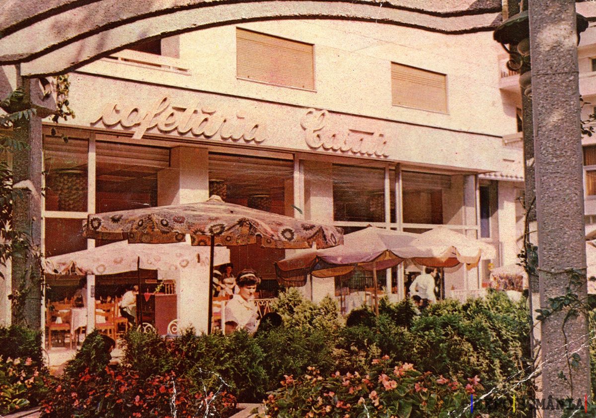 Imaginea prezintă o terasă a unei gelaterii situate în București, cu un aspect vintage. Fațada clădirii este decorată cu numele gelateriei, scris cu litere mari și elegante. În fața gelateriei, se află mese acoperite cu umbrele colorate, oferind un loc confortabil pentru clienți. Grădina din jur este plină de plante verzi și flori, creând o atmosferă plăcută și primitoare. Persoanele din imagine sunt îmbrăcate în stilul specific vremii, adăugând un aer nostalgic scenei. Lumina soarelui luminează întreaga zonă, accentuând detaliile arhitecturale și naturale.