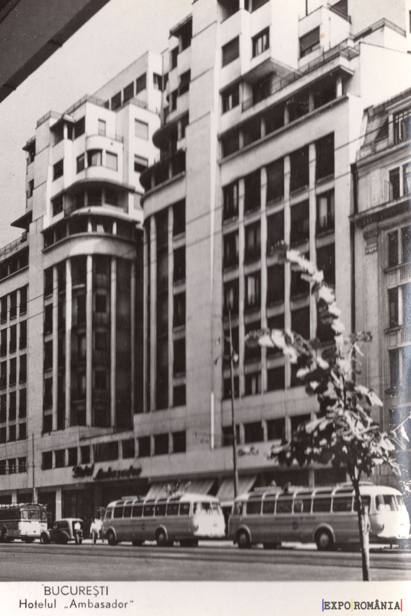 Imaginea prezintă o carte poștală din București, evidențiind Hotelul „Ambasador”. Clădirea are un design modern, cu linii arhitecturale clare și feronerie din sticlă. Fațada este compusă din mai multe niveluri, iar la parter se află intrarea principală, marcată de un semn distinctiv. În fața hotelului, se pot observa autobuze parcate, sugerând o activitate urbană intensă. Pe marginea străzii, un copac adaugă un element natural peisajului urban. Fundalul arată alte clădiri, caracteristice orașului, completând atmosfera bucureșteană. Imaginea este în tonuri de alb și negru, conferind un aer nostalgic.