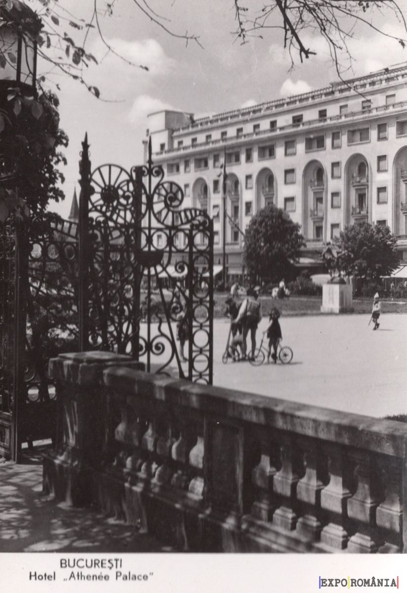 Imaginea reprezintă o carte poștală din București, surprinzând o scenă urbană dintr-o zonă centrală. În prim-plan, se află un gard ornamental, cu detalii elaborate, care delimitează o piață. În fundal, se poate observa clădirea Hotelului „Athenee Palace”, un edificiu impunător cu arhitectură elegantă, caracterizat prin feronerie și feronerie decorative. Pe aleea din fața hotelului, câțiva oameni se plimbă, iar un biciclist traversează zona. Cerul este senin, iar copacii din jur adaugă un strop de verdeață peisajului urban. Atmosfera evocă o zi liniștită în capitala României.