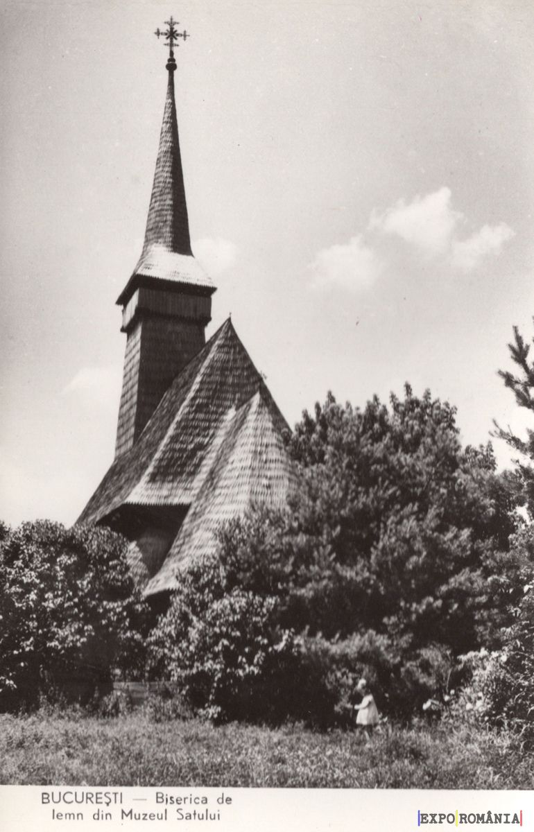 Imaginea reprezintă o biserică de lemn situată în București, parte a Muzeului Satului. Clădirea are un turn înalt, acoperit cu țiglă, și un acoperiș ascuțit, specific arhitecturii tradiționale românești. Biserica este înconjurată de vegetație abundentă, cu copaci și arbuști care îi oferă un cadru natural. Cerul este senin, iar lumina soarelui accentuează detaliile arhitecturale ale bisericii. În partea dreaptă a imaginii, se poate observa o siluetă umană, sugerând prezența vizitatorilor în acest loc de cultură și istorie. Textul de pe cartea poștală indică locația și denumirea bisericii.